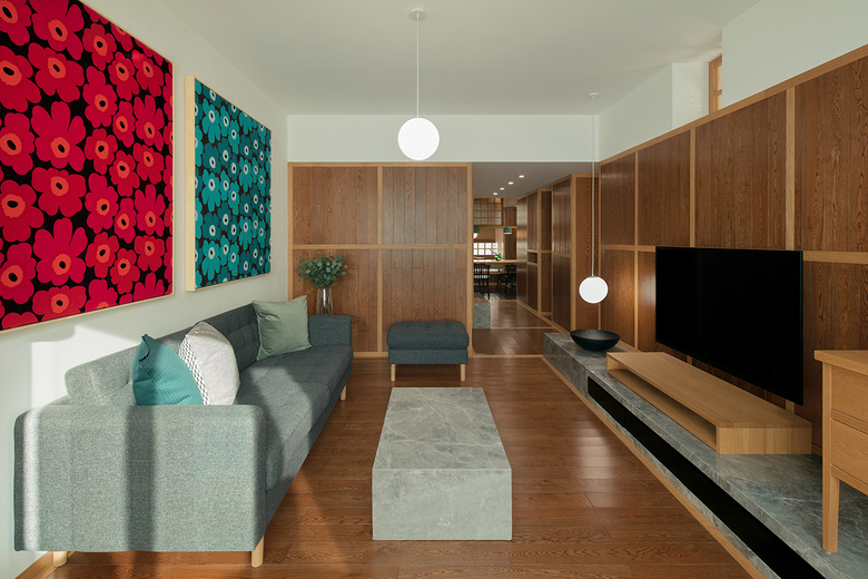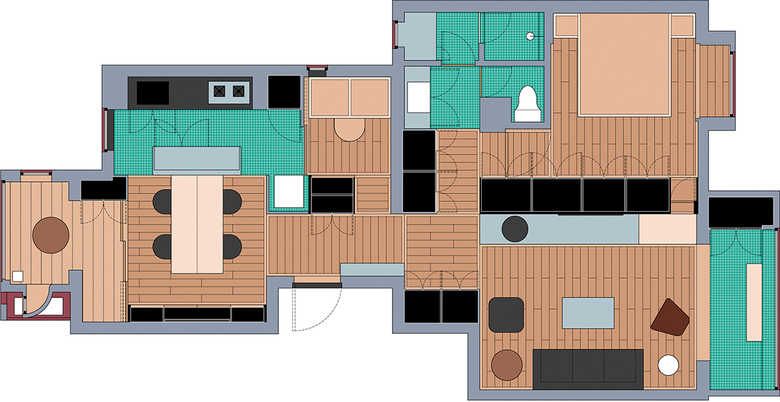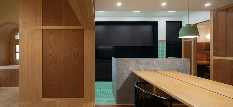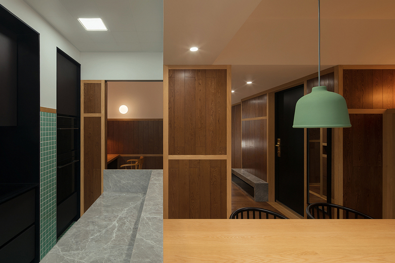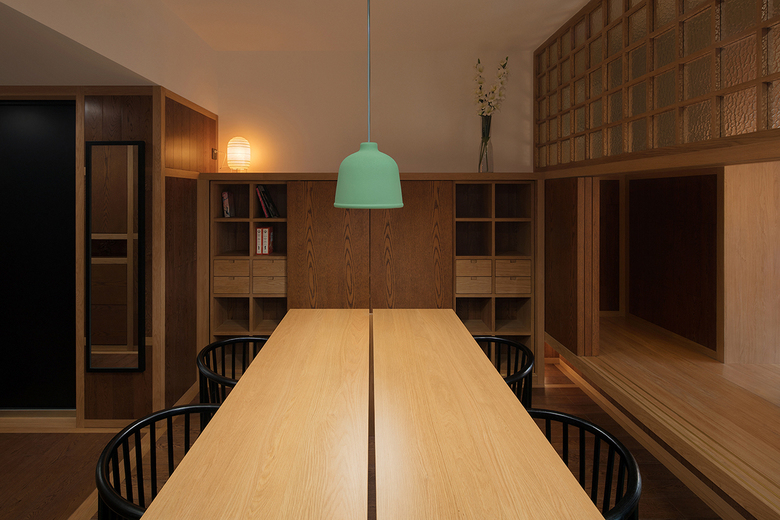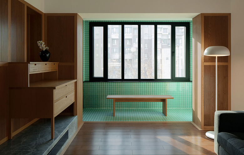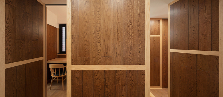 DAS also used various materials in this case. The wall and floor are covered with grids created by natural varnished oak stripes and chestnut-colored oak planks. The furniture is made from black-painted boards, natural varnished oak, chestnut-colored oak veneer, grey marble, and red copper. Rippled glass is used for the window opening, making the shadow hazy and crushing. Green mosaic is for the wet areas. The wall of the tearoom is covered in diatom mud.