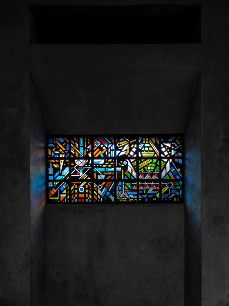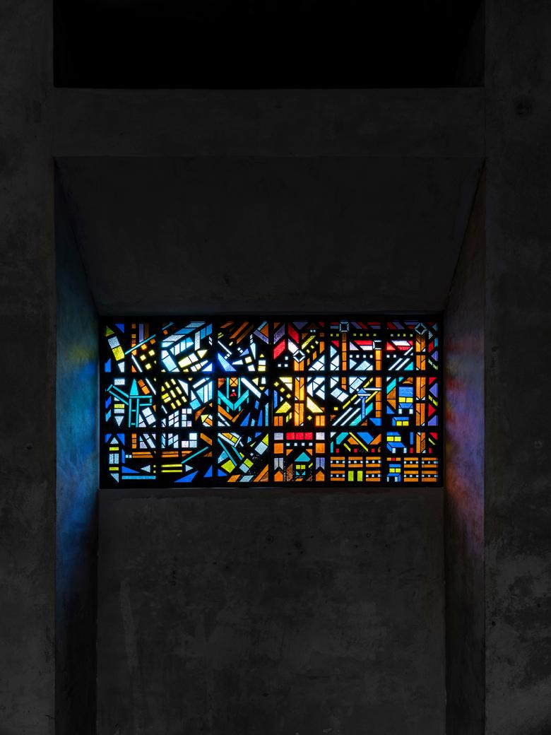 In DAS’ previous works, they always rely on many details of life for the portrayal the everyday space. But in this piece, the details of everyday life become some abstract and simplified symbols: dancers wearing hanbok dress, groups performing gymnastics, portrait of the leader, sentinels, police booth, chimneys, trucks … On one hand, this is to adapt to the production process of stained glass, avoiding the production challenges of too fine details. On the other hand, it reflects the sense of mystery and strangeness that one would feel when looking across the river to North Korea.