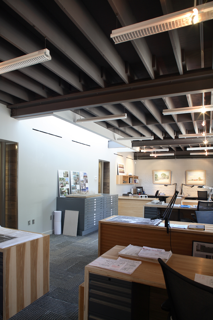 Renovation of a one-story commercial building into an architect’s office and studio, keeping slightly reminiscent of its 1950s ancestry, while stepping into the current emerging arts district environment. The transformation began with removal of the roof and interior walls. Within the existing exterior walls and foundation, a new steel frame provided the support for the higher roof and created an open plan, while large wall openings were cut to allow for natural light, entry doors, and views. Insulation and a new skin of slate and standing seam metal layered over the existing masonry walls created a more watertight, insulated enclosure while preserving existing materials. The configuration of the light monitors shields the spaces below from direct sun while providing indirect light and color that changes with time of day, time of year, and weather conditions. Duvall Decker acting through its development entity, Eldon Development, led the development and financing of the project and served as architect for the design of the facility.