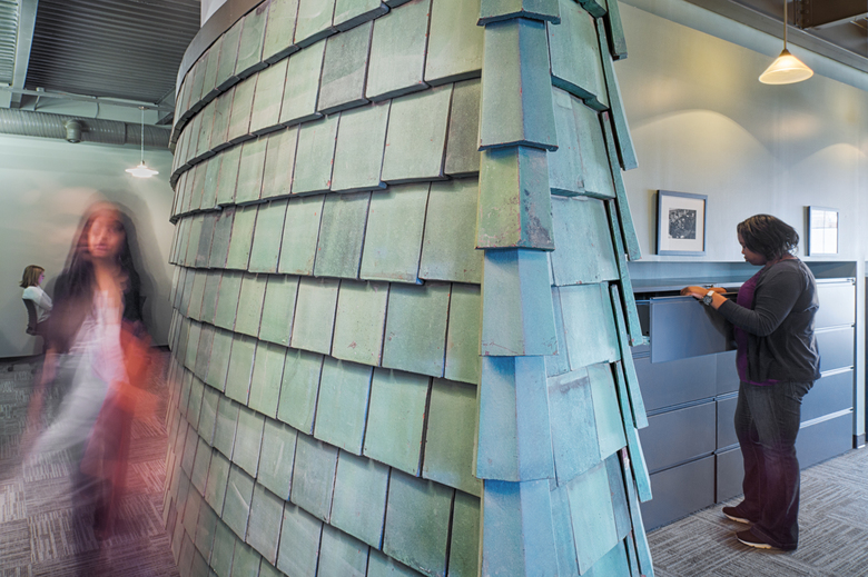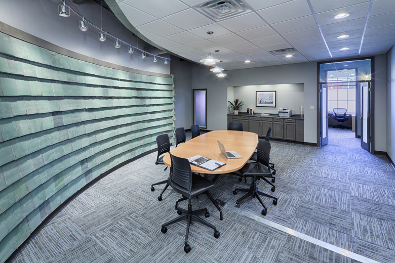The three-part design started with the shell, the abandoned furniture store cleaned out and repaired. The order of rooms in which legal service office operations take place, are built with inexpensive gypsum board partitions. The rooms are located to allow natural light to course into the inner plan. At the heart of the plan, a dynamically-shaped, clay-tile sheathed wall arcs and leans through the space, providing a landmark that not only unites all the rooms, but more importantly, establishes a tactile enveloping, dynamic anchor; a kind of inner horizon that is both secure and hopeful about the future.