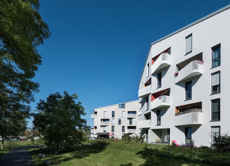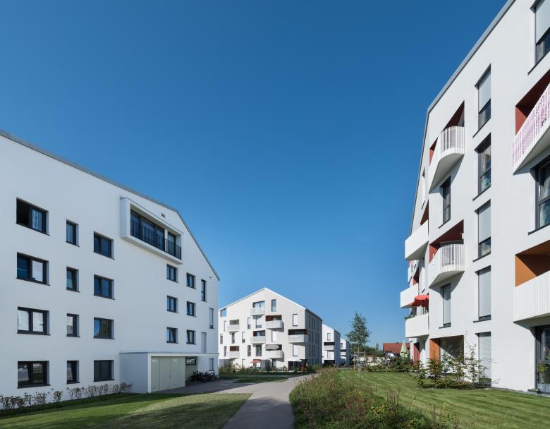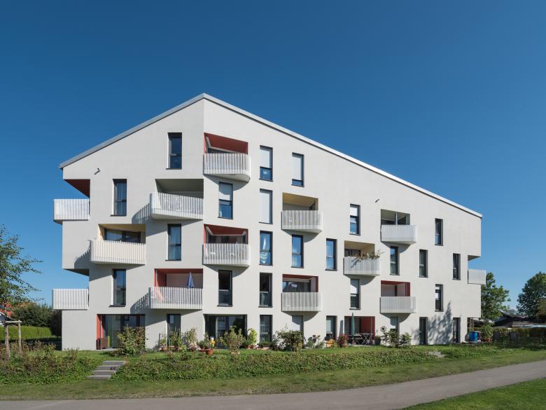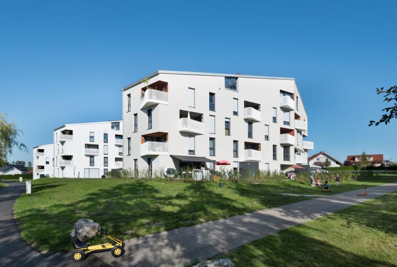 Die Gebäude beinhalten jeweils 13 bis 18 Wohnungen, je 3 bis 4 im Regelgeschoss und 1 bis 2 je Dachgeschoss. Durch die unterschiedlichen Gebäudelängen ergibt sich ein variabler Mix aus 2-Zi. bis 5-Zi.-Wohnungen. Allen Erdgeschosswohnungen sind eigene Gartenbereiche mit geschützter Loggia direkt zugeordnet, alle anderen erhalten Loggien mit Balkon, die Dachgeschosswohnungen großzügige Dachterrassen.