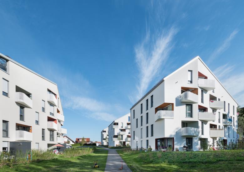 Das Quartier verbindet sozial geförderte Mietwohnungen und Wohneigentum zu gleichen Teilen. In der äußeren Erscheinung und Wertigkeit sind die einzelnen Häuser jedoch bewusst gleich gestaltet, so dass man ihnen nicht ansehen kann, wer sie bewohnt. Die leicht polygonal geformten, aber in einer Ordnung zueinander stehenden Gebäude, geben dem Außenraum Leichtigkeit, die besondere Balkon-Loggien-Kombination, entworfen mit der Assoziation zu Stadtvillen, schafft als spielerisches Element überdachten privaten Freiraum sowohl für das persönliche Schutzbedürfnis als auch für das „vor die Fassade treten“. Dieses besondere und verbindende Gestaltungsmerkmal vereint die Hausgruppe trotz unterschiedlicher Grundrisse, Materialien im Ausbau und Bewohnerstruktur. Alle Bewohner erfahren die gleiche Wertschätzung. Der private Freibereich, ein zentraler Teil des Wohnraums, und das wichtigste Bindeglied zum öffentlichen Außenraum, ist immer gleich.