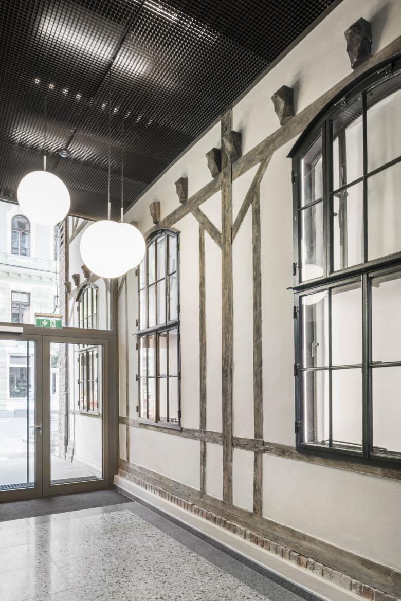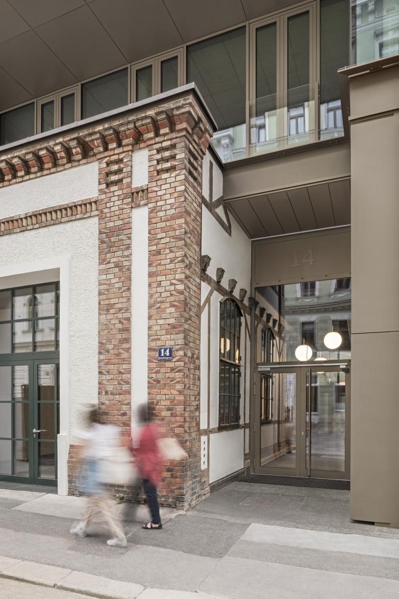 Über Jahrzehnte prägte eine ungewöhnliche Baulücke in der Straußengasse das Stadtbild Wiens. Die Herausforderung lag darin, eine passende Lösung für den enormen Druck der Nachverdichtung zu finden und dabei den Bestand angemessen zu berücksichtigen. feld72 hat ein Gebäude entwickelt, das sich respektvoll über das Fachwerkhaus stülpt und die Baulücke mit eleganter Leichtigkeit schließt. Dadurch wirkt das Fachwerkhaus wie freigestellt im Straßenraum: es entsteht eine markante Adresse. Die Typologie des produktiven Stadthauses mit einem gewerblich genutzten Sockel und Ateliers im Hoftrakt wird aufgegriffen. Gestalterisch im Fokus liegt die filigranen Fassadengestaltung des Neubaus mit industriellen Akzenten, die das Bestandsgebäude referenzieren. Sie vermittelt Leichtigkeit und Eleganz. Der Mehrwert der vorgelagerten Pufferzone ermöglicht den BewohnerInnen eine Aneignung und die individuelle Gestaltung von Licht- und Klimaverhältnisse und visueller Durchlässigkeit.