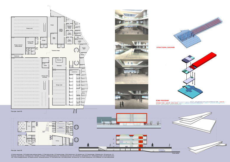 On the first floor, above the entrance block, there are the museum service spaces and rooms for educational activities, such as open-plan offices, meeting rooms and research laboratories. At the second floor there are workshops, classrooms and an auditorium. The museum's collections are housed in the longitudinal body with spaces for the display of temporary exhibitions.