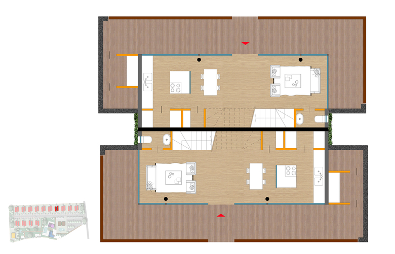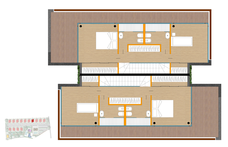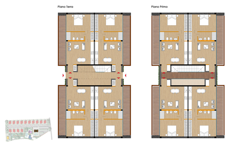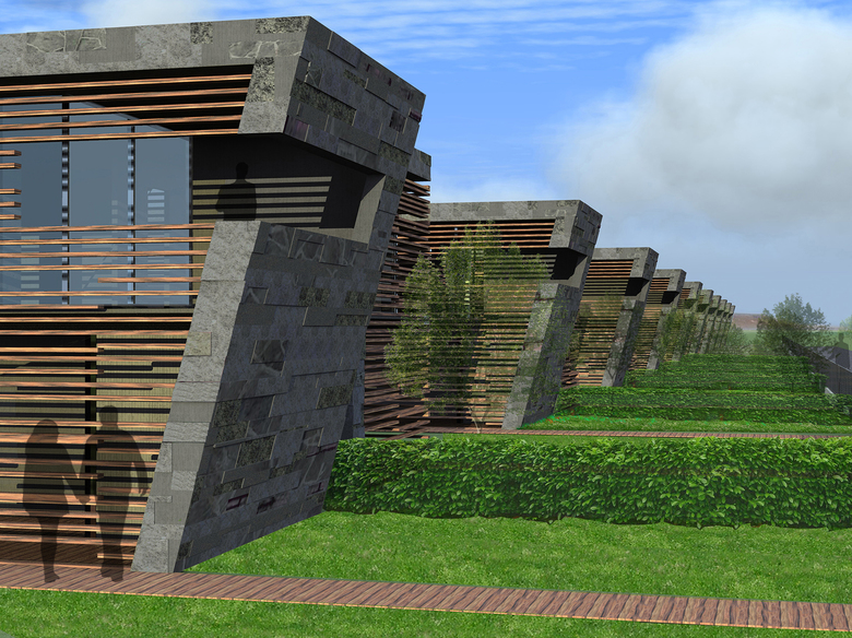 NBD Country Complex purpose is to realize single family residences in a privileged area, at the base of Colli Euganei Natural Park, enjoying the benefits of country living and contemporary comfort. A group of eight residences is reunited in a two floors building, close to the complex facilities such as a SPA and a wellness area, a swimming pool and a restaurant. Other 28 two floors single family residences, divided in 14 pairs, are spread all along the area and allow the guests to enjoy the natural landscape, thanks to their private gardens. Facades are covered by a second skin made of wooden brisoleils that allows interior privacy and countryside view at the same time.