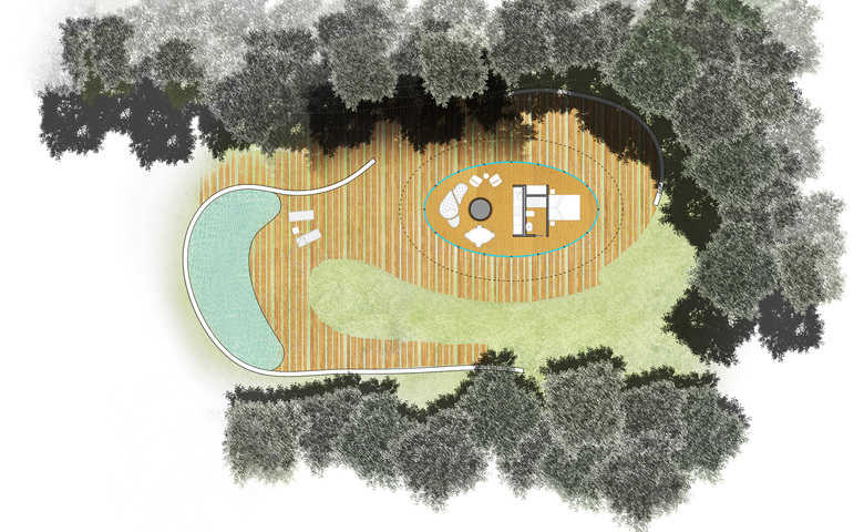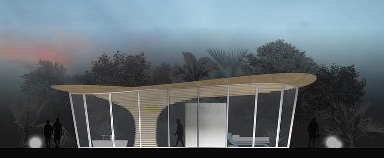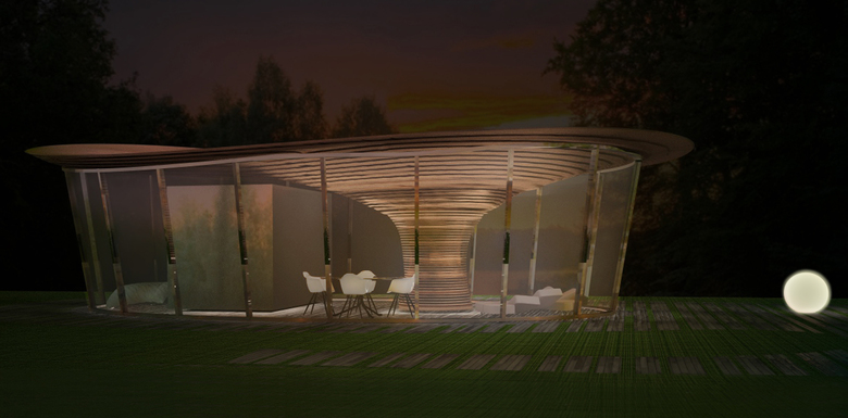 Compared to traditional settlements, where buildings contrast with green space, Tree House wants to relate to natural environment by inserting like in a camouflage. Nature becomes a source of inspiration for the architectural volume, but not slavishly imitated: a single point of support, expanding at the top as a large trunk, supports the roofing, that moves freely in space as the foliage of a tree. Parallel bands encircle the whole volume, starting first horizontally, then with free curves following the roofing that develops in space with an irregular shape.