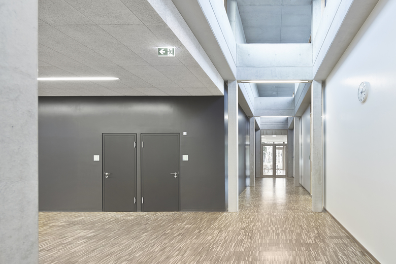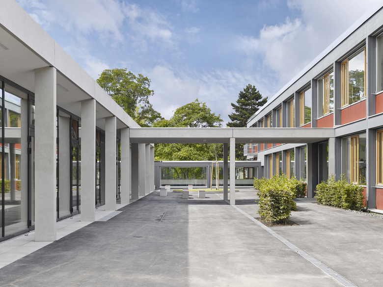 Der neue Baustein setzt die bestehende orthogonale Bebauungsstruktur fort. Im Unterschied zum Bestands-gebäude mit seinen bandförmigen Brüstungsfenstern öffnet sich der Neubau jedoch mit seiner raumhohen Verglasung großzügig zum angrenzenden parkähnlichen Grünbereich. Es entsteht im Gegensatz zu den nur zu Unterrichtszwecken genutzten Räumen im Altbau ein fließender Übergang zwischen Innenraum, vorgelagertem überdachtem Terrassenbereich und Außenraum. Den eigentlichen räumlichen Abschluss findet das erweiterte Schulareal nun mit dem alten Baumbestand am südlichen Ende des großzügigen grünen Außenbereiches.