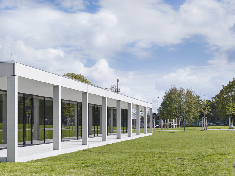 Tragwerk und Nutzungsflexibilität – Mit dem Ziel einer maximalen Nutzungsflexibilität über den gesamten Lebenszyklus des Gebäudes wird der Pavillon komplett als Skelettbau mit einer weitspannenden Decke ausgeführt. Die Stahlbetonstützen befinden sich ausschließlich entlang der Gebäudeaußenkante sowie innerhalb des vom Brandschutz geforderten innenliegenden Flures. Sämtliche Aufenthaltsräume sind frei von tragenden Bauteilen. Alle Innenwände können entsprechend späteren Nutzungsanforderungen mit überschaubarem Aufwand versetzt werden.