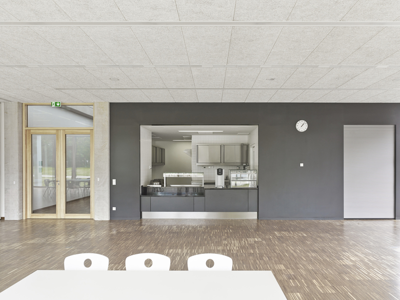Gebäude – Direkt angrenzend an den neuen zentralen Verteilerbereich zwischen Altbau und Neubau befindet sich die neue Mensa. Diese kann je nach Anforderung bis zu 180 Plätze aufnehmen, bei Bedarf mittels einer mobilen Trennwand jedoch auch verkleinert werden. Die großen Gruppenräume orientieren sich alle in Richtung großzügigem südlichen Freibereich. Richtung nördlich liegendem Innenhof sind kleinere Räume für kreatives Werken sowie die Personalräume angeordnet.