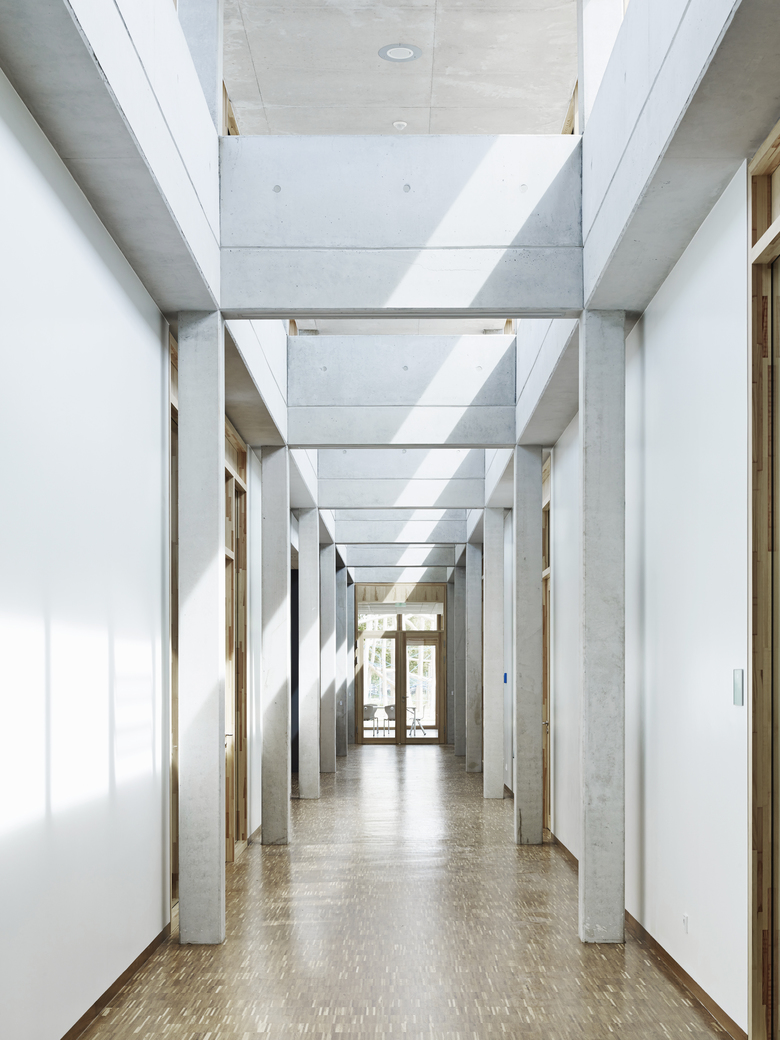 Energiekonzept – Die Heizenergieversorgung erfolgt über Fernwärme, die von einem Holzheizkraftwerk bereitgestellt wird. Die Lüftung sämtlicher Räume erfolgt gebäudezentral mit Wärmerückgewinnung. An Waschtischen und Hand-waschbecken wird bewusst nur Kaltwasser bereitgestellt. Mit den großen südorientierten Verglasungen werden winterliche solare Gewinne erzielt, im Sommer werden die Verglasungen durch die vorgelagerte Terrassenüberdachung sowie bei Bedarf mittels außenliegendem Sonnenschutz verschattet. Mit diesem Maßnahmenpaket wird gewährleistet, dass der Betrieb wirtschaftlich und mit geringem Primärenergieaufwand erfolgen kann.