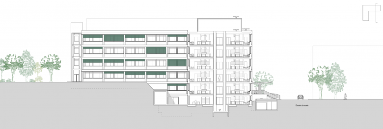 Eine sanfte Renovierungsstrategie bewahrt das emblematische Betongitter der Fassade, ersetzt die Füllelemente durch vorgefertigte Holzelemente und integriert eine Dämmschicht zur Verbesserung der Klimahülle. Architektonisch wird auch die Nachhaltigkeit zum Thema, indem die Brüstungen im Re - Use Prinzip durch die alten aufbereiteten Fenstergläser materialisiert werden.