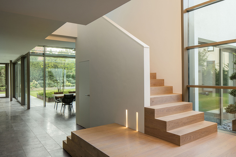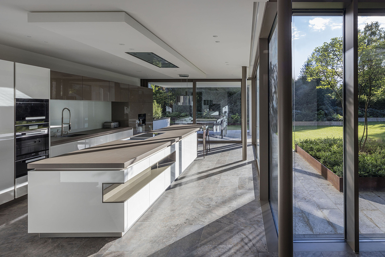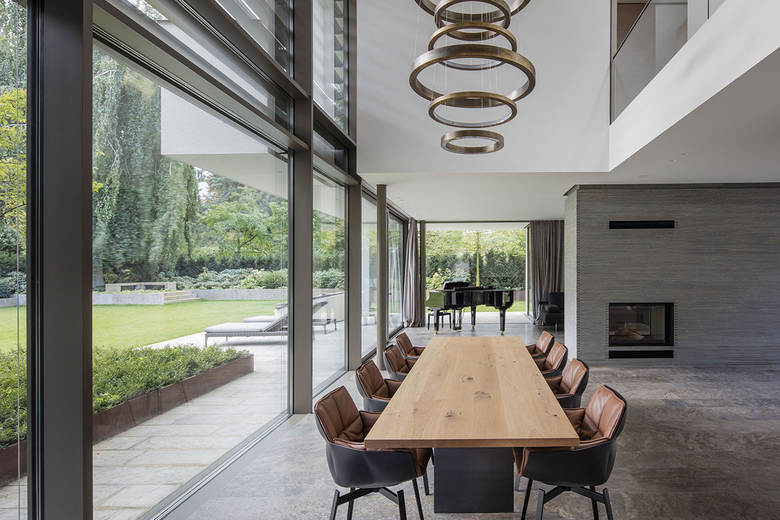 Die Luftigkeit setzt sich im Inneren fort durch einen 2-geschossigen Raum im Herzen des Winkelbaus. Von hier aus können die Bewohner in alle Richtungen Blickkontakte herstellen. Thematisch passend ist hier der große Esstisch als kommunikatives Zentrum, mit Blick in den Garten, platziert. Der Übergang vom Öffentlichen Essbereich zu den privaten Räumen bildet die Galerie im Obergeschoss. Wie über eine „Hängebrücke“, die man hinter sich hochziehen kann, gelangt man zu Schlafzimmern, Ankleide, Badezimmer und Wellnessbereich.