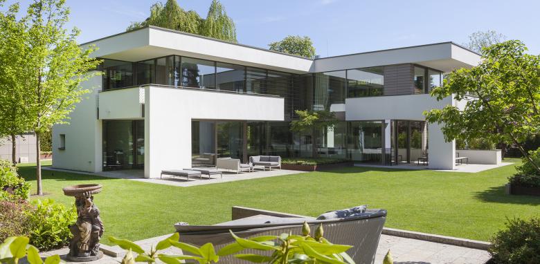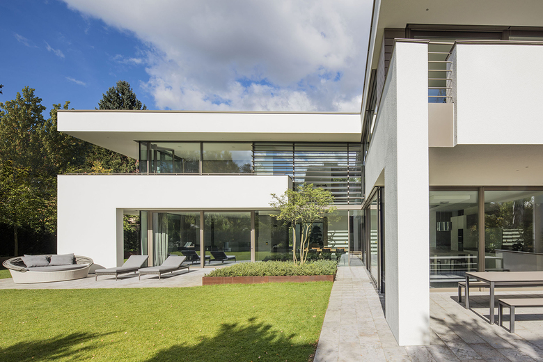 Die Gebäudehülle fällt durch ihre 3-Dimensionalität auf. Die Fassade ist nicht einfach eine Wand mit Fensteröffnungen, sondern besteht aus einem Glas- und Keramik-„Kern“. Weiß verputzte Wandscheiben scheinen davor zu schweben. Diese schützen die Bewohner vor neugierigen Blicken, lassen aber durch ihren Abstand von der Glasfassade viel Licht ins Gebäudeinnere. Durch so viel Transparenz wird maximaler Bezug zur umgebenden Natur ermöglicht. Das weit auskragende Dach sorgt für Verschattung im Sommer und schließt die 2. Gebäudehülle optisch ab. Der Raum zwischen Glasfassade und Wandscheiben bietet sich an für Terrassen und Balkone. Die Kombination aus der spiegelnden Glasebene und den davor schwebenden weißen Flächen verleiht dem Gebäude eine moderne Anmutung. Doch der Purismus der Moderne erhält hier eine leichte, spielerische Note und verliert seine Kühle durch das dreidimensionale Spiel von Formen, Material, Licht und Farbe.