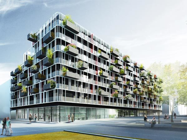 Über dem Erdgeschoss entwickelt sich eine mehrschichtige Fassade: umlaufende, wohnungsbezogene Freibereiche werden durch eine durchlässige, membranartige Metallstruktur aus Stäben unterschiedlicher Stärke und transluzenten Geländern begrenzt. Die Membran wirkt als Filter zur Stadt. Sie wird von schubladenartigen Balkonen unterschiedlicher Größe durchdrungen, welche gemeinsam mit den seitlichen Begrünungen die dritte Fassadenebene bilden.