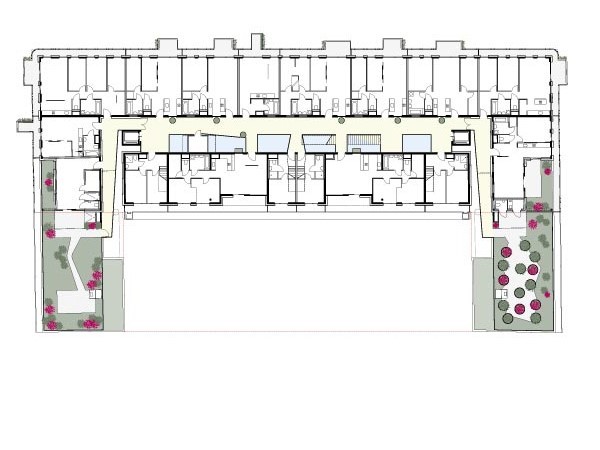 Das konstruktive System der Schottenbauweise schafft in Kombination mit dem Konstruktionsprinzip des „Stadthauses“ ein ideales statisches Gesamtsystem und erlaubt ein behutsames Staffeln des Baukörpers des „Gartenhauses“.