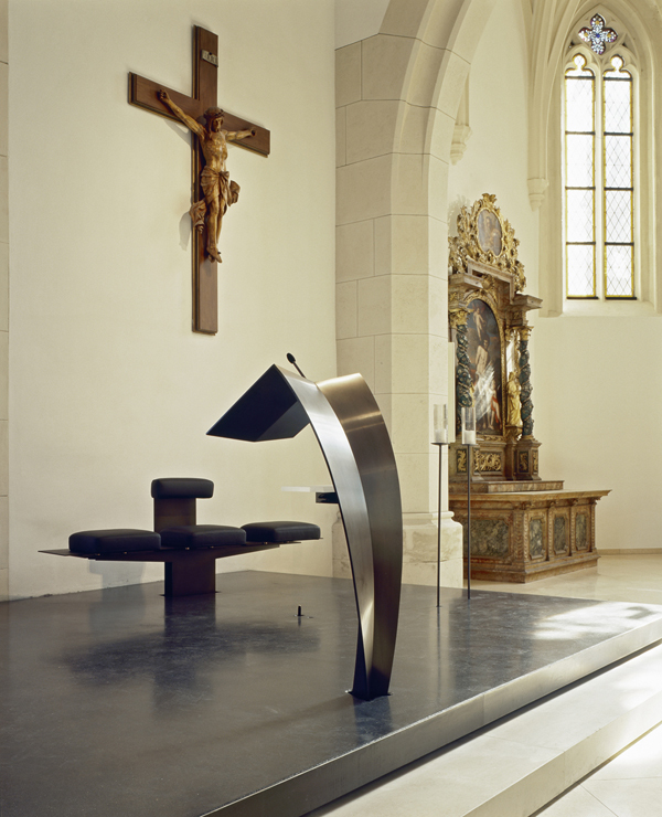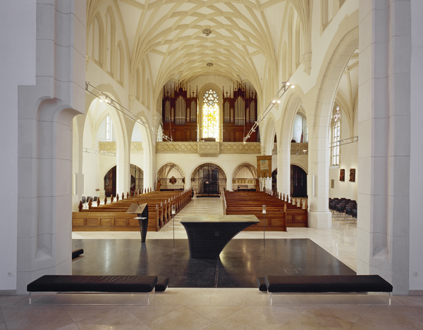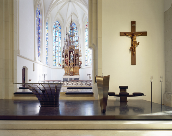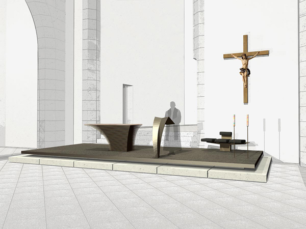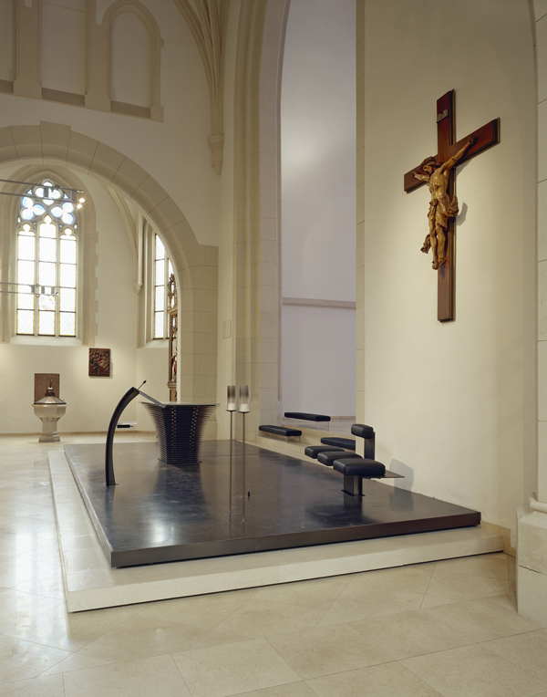 Die asymmetrische Öffnung des Presbyteriums zum Hauptschiff wird in der liturgischen Neugestaltung mit einbezogen. Durch die symmetrische Ausrichtung zum Langhaus wird das historische Kreuz im Altarraum aufgegriffen – das Kreuz wird Teil des Altarraums.