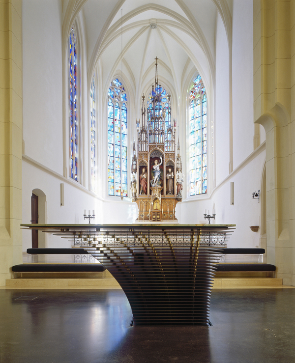 Der Altar nimmt Bezug auf den Ort des Tabernakels und auf das Hauptschiff der Kirche – er ist das Zentrum. Die Basis des Stipes ist zum Hochaltar ausgerichtet. Die 33 brünierten Edelstahlplatten des Stipes symbolisieren die Lebensjahre Christi und sind jeweils zueinander verschwenkt. Sie leiten damit zur Mensa und ihrer Ausrichtung über.