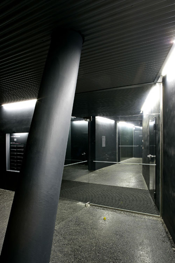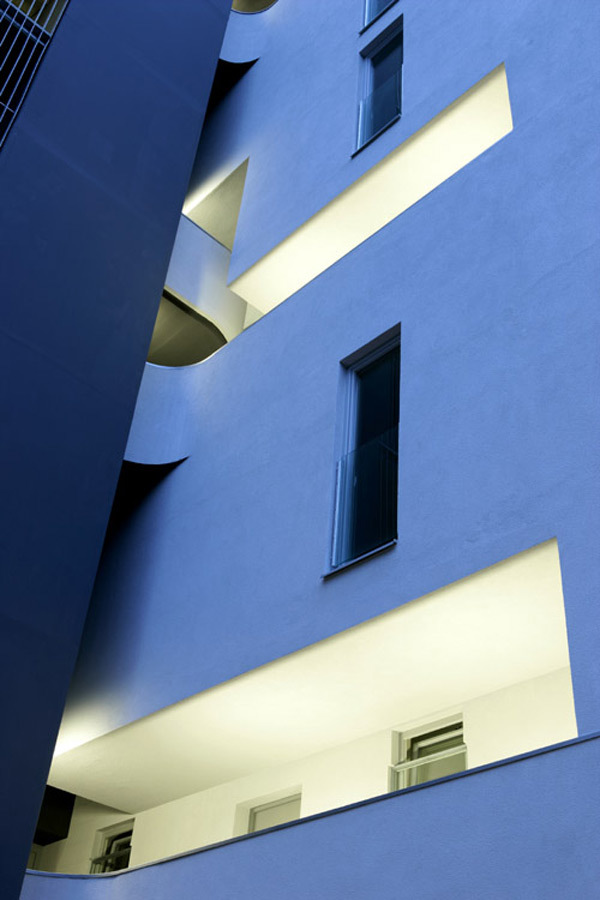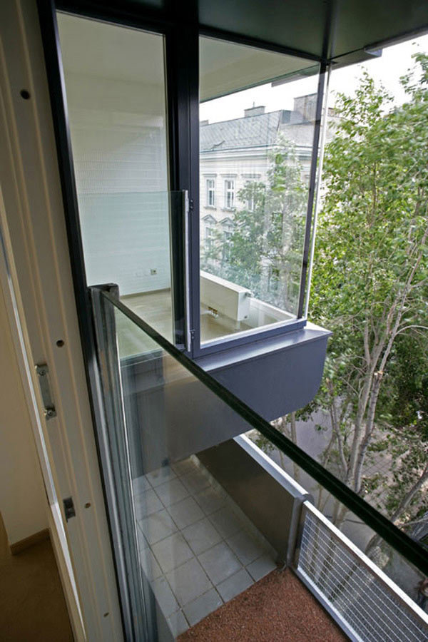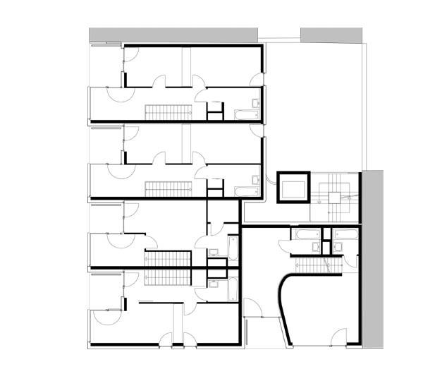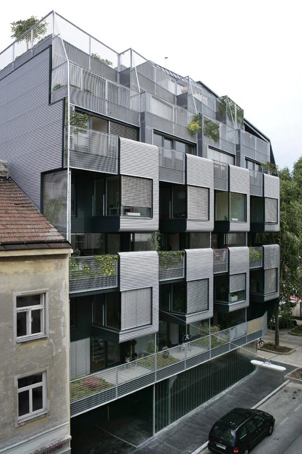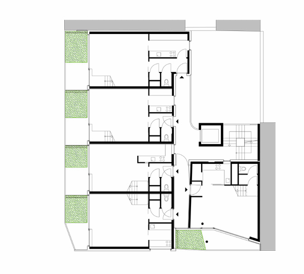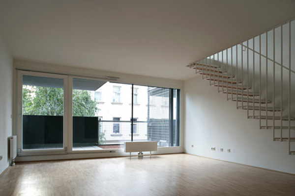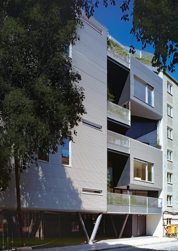 17 Wohnungen, vorwiegend zweigeschossig organisiert, bilden die Struktur des Hauses. Die hohe Dichte des Wohnraumes, hervorgerufen durch die städtebauliche Disposition des Grundstückes an der Blockecke, wird durch die Planung eines großzügigen, allen Bewohnern zur Verfügung stehenden Nutzraumes kompensiert. Die Erdgeschosszone wird baulich transparent behandelt und freigehalten für gemeinschaftliche Bereiche, (Kinderspielraum, Werkstatt, Hobbyraum,…) – ergänzt durch einen von allen Bewohnern zugänglichen bepflanzten Dachgarten.