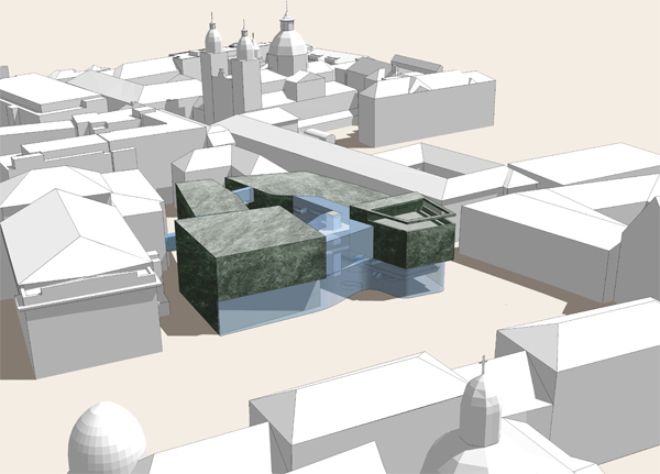 Die prominente Lage und die qualitätsvollen Gebäude in der unmittelbaren Nachbarschaft erfordern einen sorgfältigen Zuschnitt der neuen Bauvolumen. Die flächenmäßige Ausdehnung des Hauses der Musik reagiert auf die Volumen der benachbarten öffentlichen Gebäude; die Gliederung der Baumassen folgt der Maßstäblichkeit der östlich angrenzenden Baukörper.