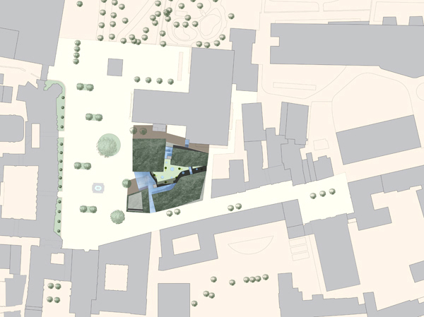 Das Haus der Musik respektiert die Bedeutung des Landestheaters durch ein leichtes Zurücksetzen und Ausschwenken des Baukörpers in diesem Bereich. Gleichzeitig wird die Lage der Naturdenkmäler respektiert und besonders die Säuleneiche in die Gesamtkonzeption integriert.