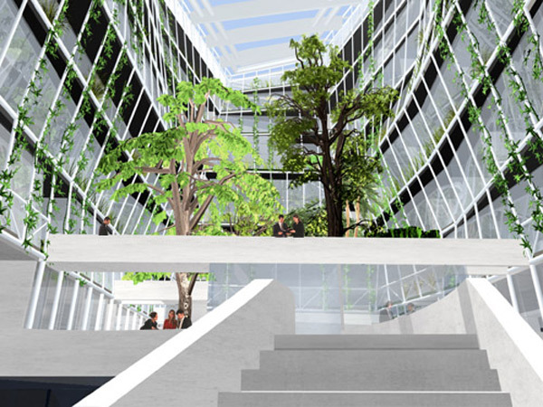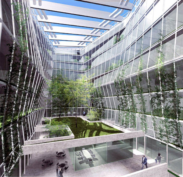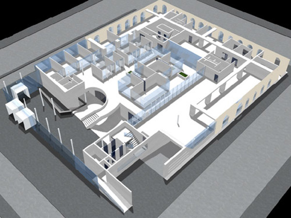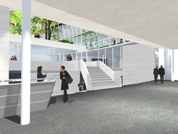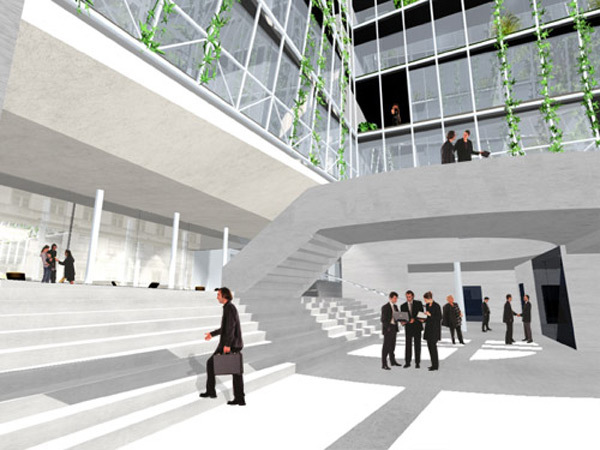 Die Neukonzeption der Zentrale der Österreichischen Volksbanken AG erforderte die sensible Gestaltung eines zeitgemäßen Bürogebäudes im Kontext der historischen Bausubstanz, die aus Rücksicht auf das Weltkulturerbe in neue Strukturen miteinbezogen wurde. Die öffentlichen Bereiche, wie etwa das zentrale Kundencenter im Erdgeschoss, oder der multifunktional nutzbare Konferenzsaal im Souterrain, sind von der Eingangshalle aus gut überschaubar. Das begrünte Atrium bildet das kommunikative Herz des Gebäudes. Vom 1.OG bis ins 2.DG bilden begehbare Grünzonen mit der vertikalen Bepflanzung des Innenhofes eine dreidimensionale Landschaft mit hoher Aufenthaltsqualität. Die freien Grundrisse der Bürogeschosse (mit 852 Arbeitsplätzen) lassen vielfältige Kombinationen von Zellen- und Kombibüros zu. Variable Trennwände gewährleisten dabei optimale Reaktionen auf sich verändernde Raumkonstellationen.