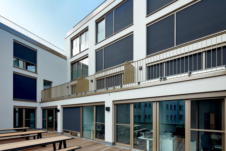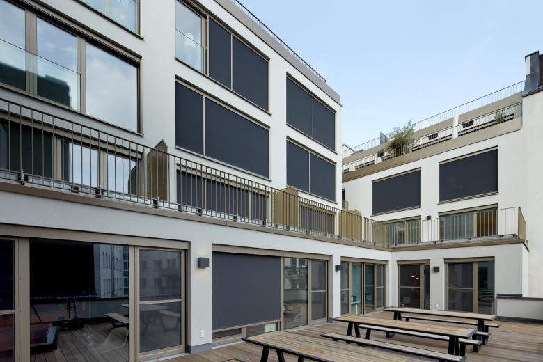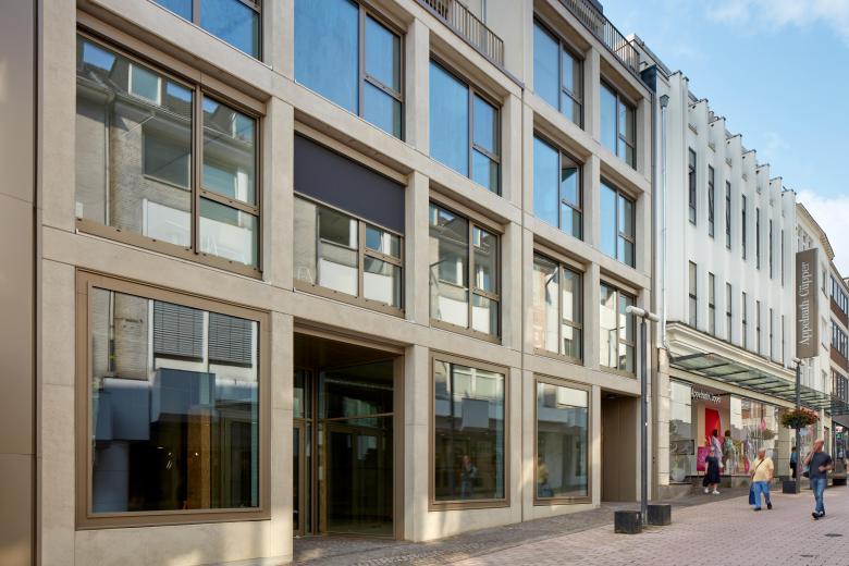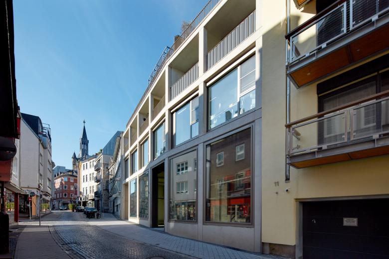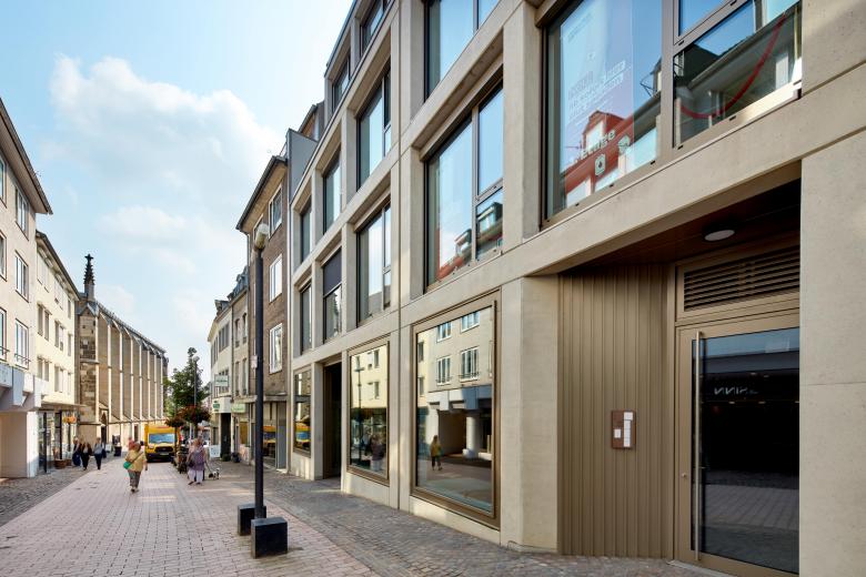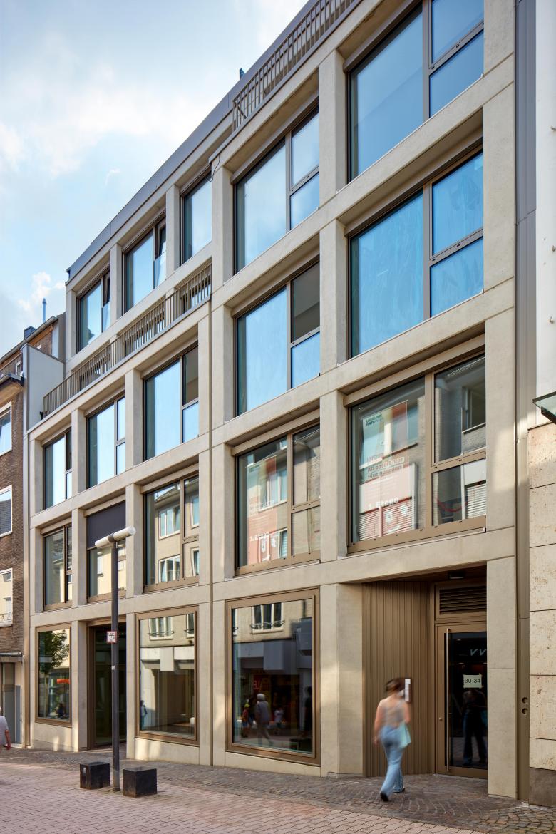 Der Neubau umfasst im Erdgeschoss eine Verkaufsstätte, die sowohl von der Großkölnstraße als auch Kleinkölnstraße zugänglich ist. Über der Verkaufsstätte gibt es 21 Wohnungen. Die übrigen Flächen werden als Büroräume genutzt. Um für ausreichend Belichtung und Belüftung der Wohnungs- und Büroflächen zu sorgen, wurde ein großzügiger Innenhof geplant. Die Fassadensprache entlang der Straßen nimmt die Struktur der 50er Jahre Nachbargebäude und der gegenüberliegenden gotischen Kirche in Form einer sichtbaren tragenden Skelettstruktur aus Sichtbeton auf. Das besondere hierbei ist, dass die Fassade nicht vorgehängt, sondern Teil der Tragstruktur ist.