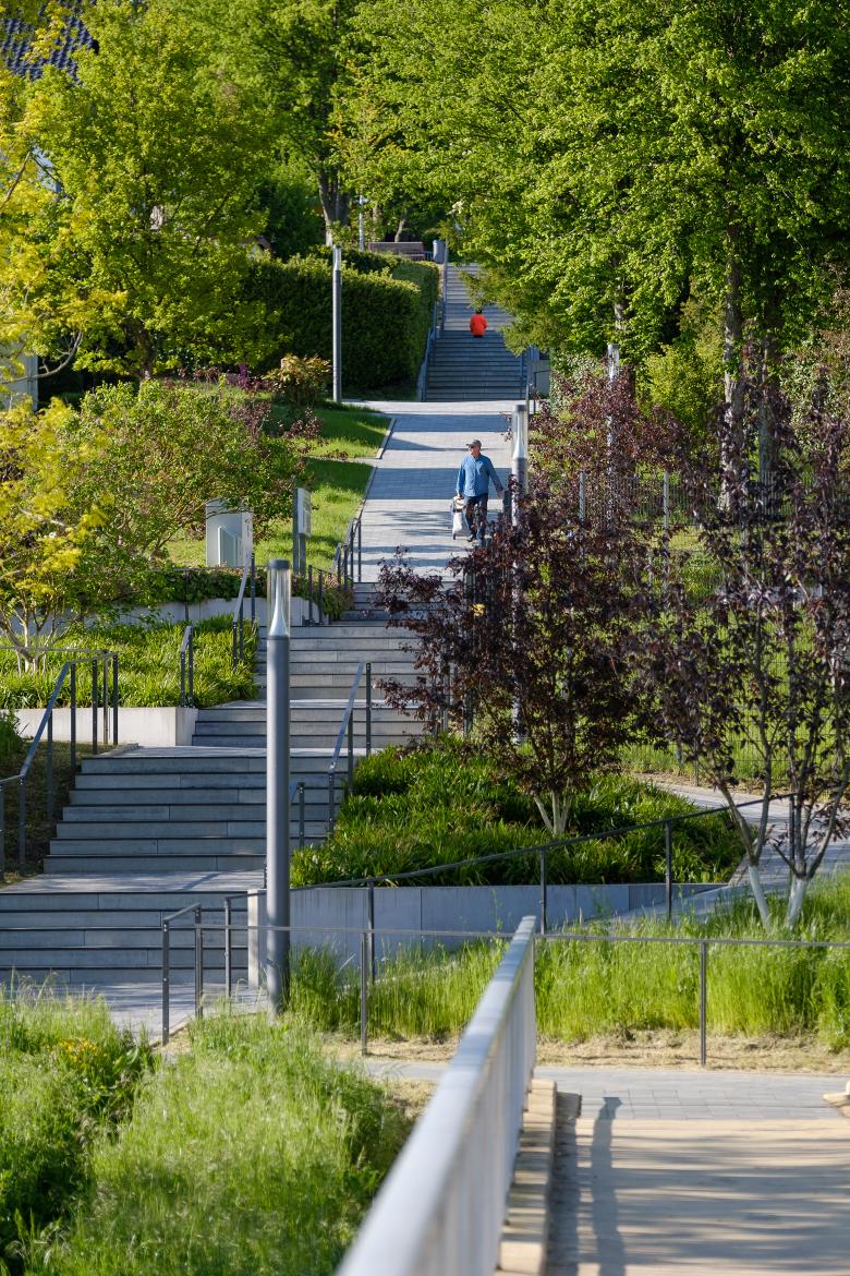 Durch den gewundenen Verlauf der Wegeführung entstand die Idee der „Landschaftskaskaden“. Diese legen sich als horizontale Ebenen in das geneigte Gelände und bilden ebenerdige Räume mit unterschiedlichen Atmosphären und Funktionen. Das Angebot von Ruhe bis Spiel und Austausch orientiert sich dabei an den Nutzungen der angrenzenden Bestandsflächen und reagiert auf diese. So bilden sich entlang der Nord-Süd-Achse neue zielgruppenorientierte Treffpunkte und Aufenthaltsräume. Ein Aussichts- und ein Aktionsplateau sowie Spielplätze und Vegetationsflächen wurden auf Bedürfnisse der jüngeren Bevölkerung ausgerichtet und angepasst. Ergänzt wird das Angebot durch Fitnessgeräte für die ältere Generation und im Zentrum durch eine Fahrradwerktstatt und eine Calisthenic-Anlage für Jugendliche. Die Außenanlagen des Schulhofs wurden mit den Schülern im Rahmen mehrerer Beteiligungsverfahren zusammen gestaltet.