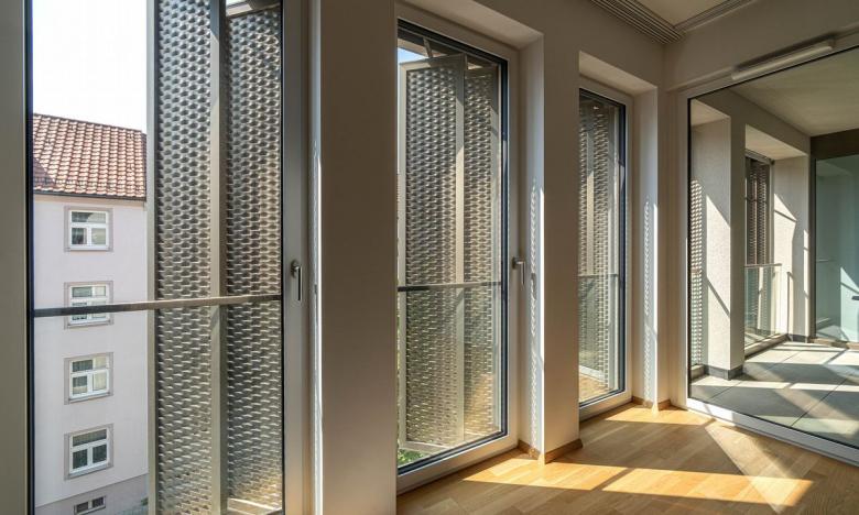 Der Bau stammt aus der Feder der Braunger Wörtz Architekten. Sie entschieden sich mit dem Faltscherenladen von Griesser für die Designikone unter den Fensterläden. Der Sonnenschutz ist nicht nur an der Fassade ein ästhetisches Highlight, sondern auch im Innern des Gebäudes. Die verschiedenen Öffnungswinkel sowie die Maschungen in den Paneelen erzeugen aussergewöhnlich schöne Licht- und Schattenspiele im Raum. Die Architekten wählten das beliebte Modell Sentum Slim, das über ein stilvolles Streckmetallprofil verfügt. Besondere Akzente setzen die Farben: Die Faltscherenläden sind in einem Bronze-Ton beschichtet, die Schienen und Blenden in einer eleganten tiefmatten Struktur.