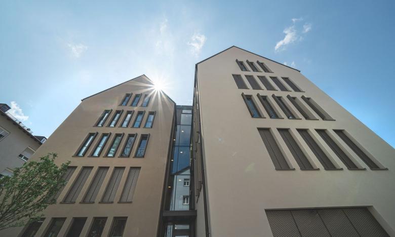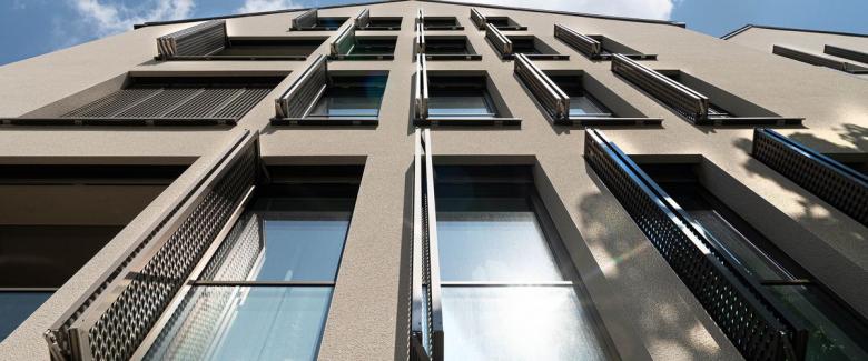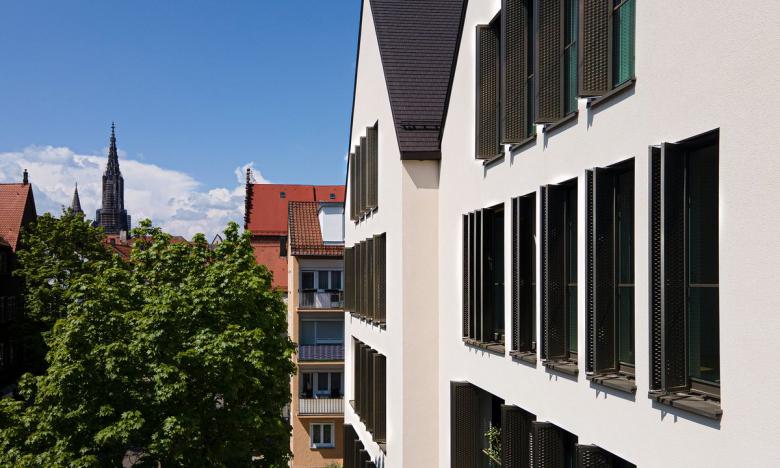 Das moderne Geschäfts- und Wohngebäude an der Gideon-Bacher-Strasse 3 in Ulm Mitte fügt sich in Form und Farbe perfekt in die Innenstadt ein. Trotzdem ist das aus drei Baukörpern bestehende Haus ein Blickfang, denn 424 Faltscherenläden von Griesser prägen die Fassade und verleihen ihr einen unverwechselbaren Charakter.