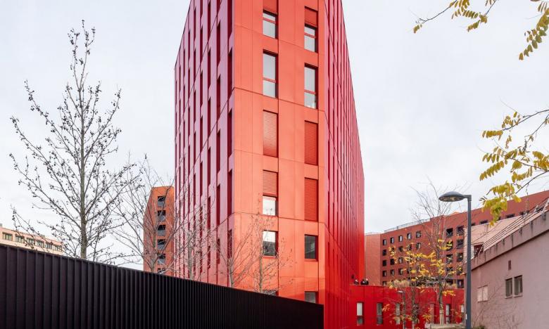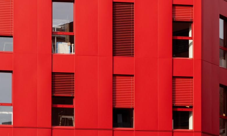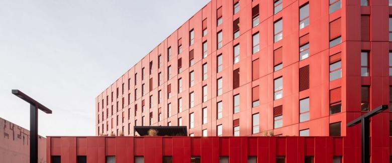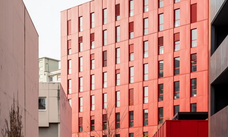 Die rote Farbe des Gebäudekomplexes Poste Weiss das Merkmal dieses neuen, dynamischen Geschäftsviertels.