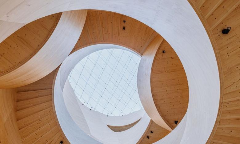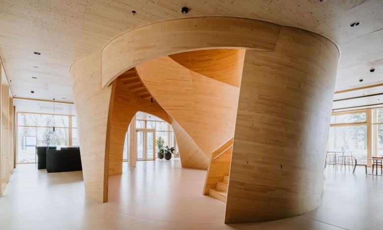 «Das Gebäude sollte Gäste und Mitarbeitende gleichermassen willkommen heissen, inspirieren und die Kompetenzen von Blumer Lehmann sichtbar machen – von traditioneller Holzverarbeitung bis zu innovativen Freiformen.» so Johanna Deinet, Architektin und Partnerin des projektverantwortlichen Architekturbüros K&L Architekten AG. Das Herzstück des hochmodernen Holzbaus, der als Büro- und Empfangsgebäude genutzt wird, ist das Atrium mit der Free Form-Treppe, die dem «Stammhaus» seinen Namen gab. Der Entwurf und die Holzbautechnik der frei geformten Treppe aus gebogenen Massivholzplatten wurde gemeinsam mit dem ICD Institut für Computerbasiertes Entwerfen und Baufertigung der Universität Stuttgart entwickelt. Sie durchdringt alle fünf Stockwerke des Gebäudes und ist vertikale Erschliessungszone und identitätsstiftender Kommunikationsraum zugleich. Die gebogenen Atrium-Flächen ermöglichen Ein- und Ausblicke, bilden Sitznischen aus und Balkone, die das Atrium mit den umliegenden Geschossebenen zusammenbringen.