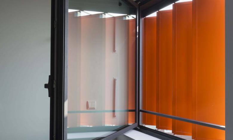 Im geöffneten Zustand stehen die Läden rechtwinklig zur Fassade, gefaltet bieten sie maximalen Lichteinfall.