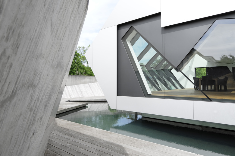 Mit einer Betonrampe über dem Wasser sind die Flächen mit dem Wohnhaus verbunden. Beton, Holz und Stahl prägen das Erscheinungsbild der Architektur. Durch die minimierte Stahlkonstruktion wirkt der Innenraum filigran und leicht. Durch die „schwebende“ Anordnung des Glaskörpers hat man einen direkten Blick auf das Wasser. Durch die Reflexionen der Wasseroberfläche aber auch durch die großzügigen Verglasungselemente werden intensive Raumstimmungen erzeugt. Die Jahreszeiten sind emotional erlebbar.