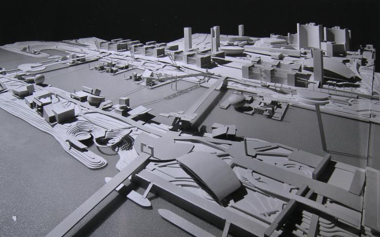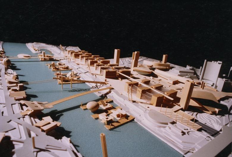 Die Blöcke finden eine Fortsetzung in schwimmenden Piers, die ein Übergreifen und Zusammenschließen mit der anderen Uferseite andeuten.