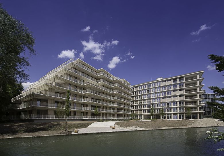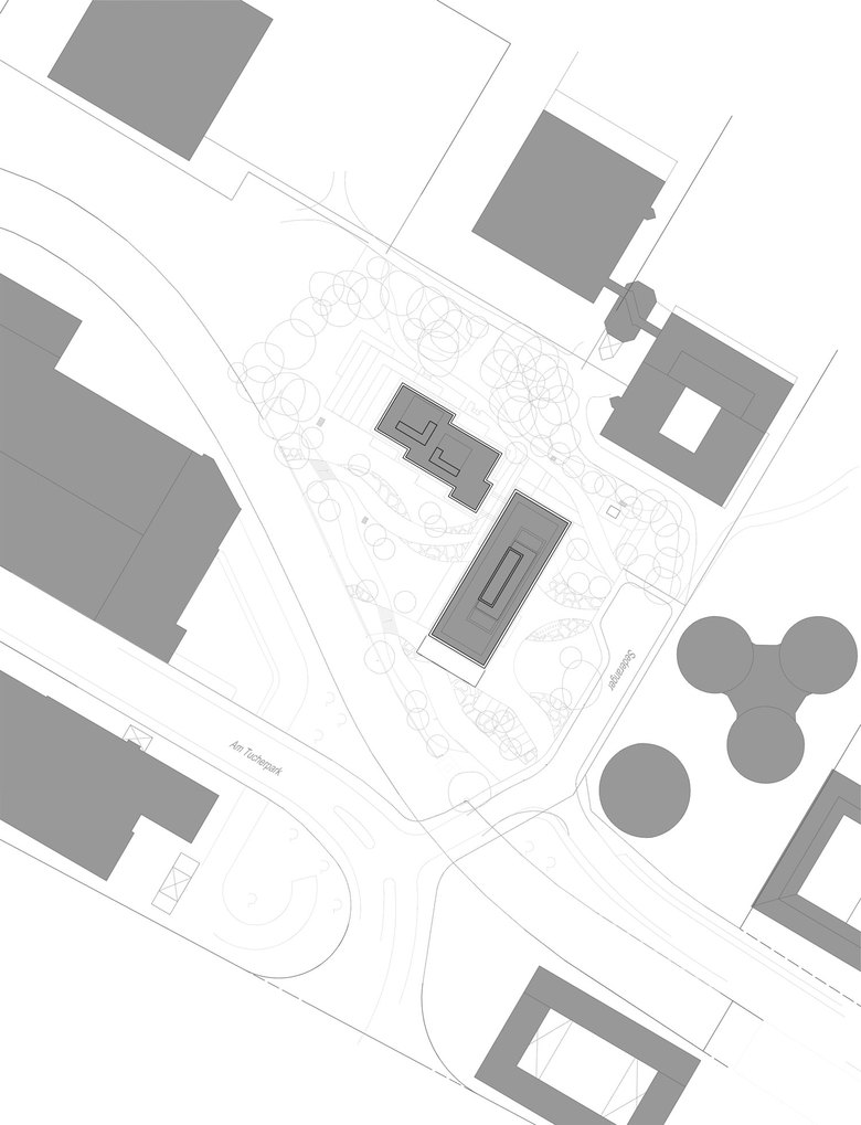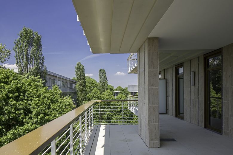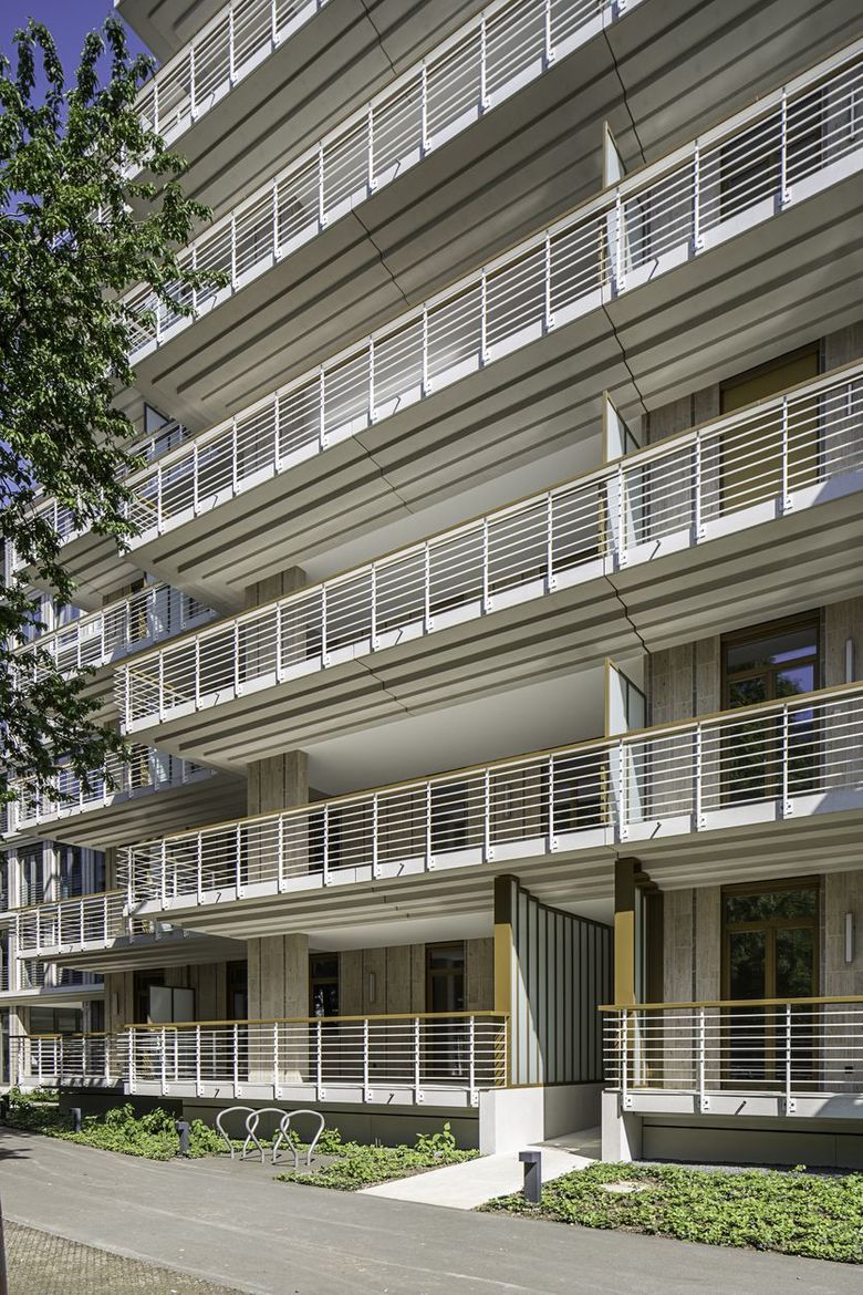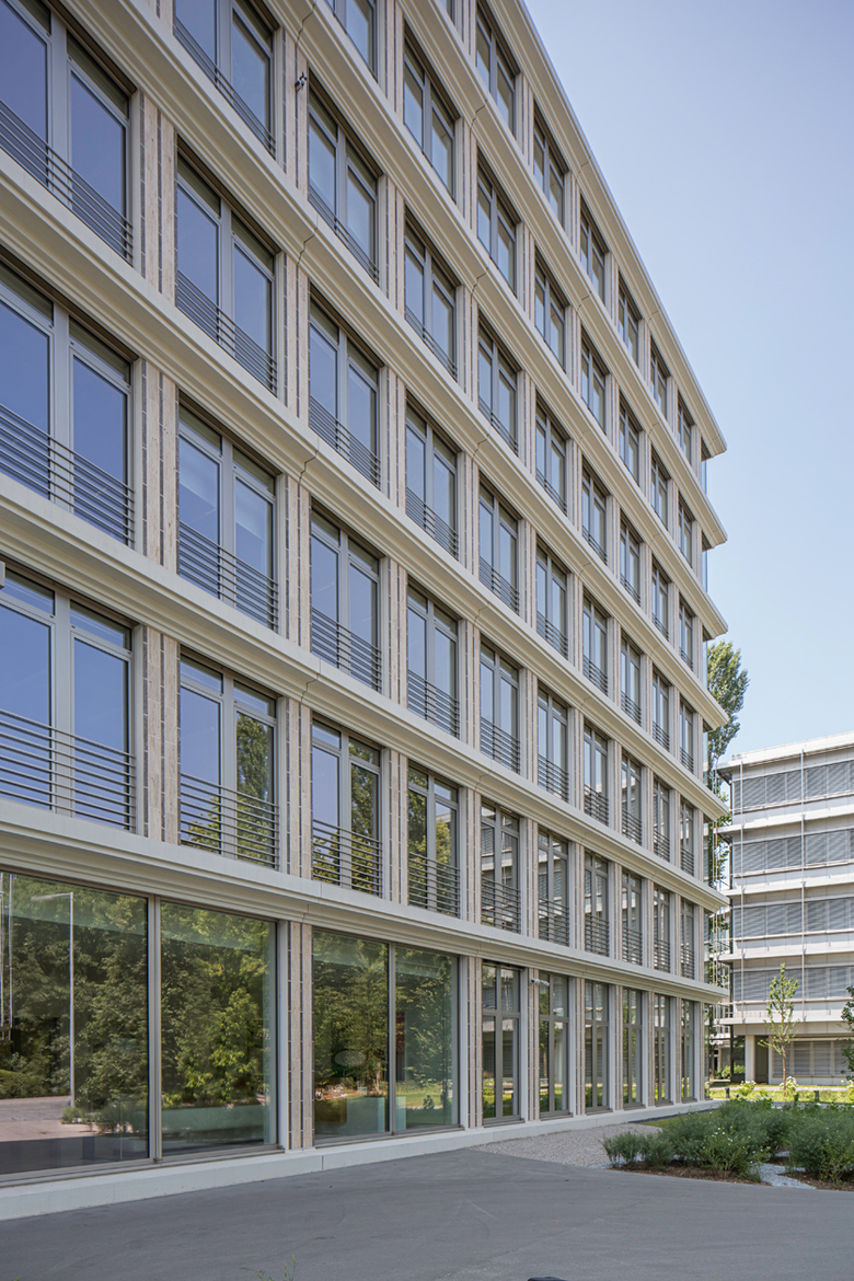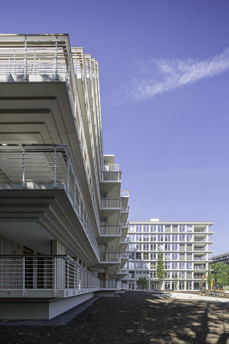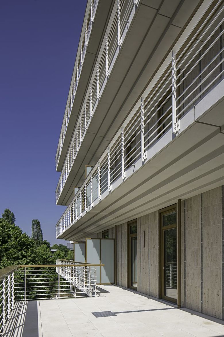 Ihren Entwurf wollen Andreas Hild, Dionys Ottl und Matthias Haber durchaus als Hommage an die Architektur des Standorts verstanden wissen. In ihrer horizontalen Schichtung lehnen sich die in Stahlbetonskelettbauweise errichteten Neubauten an den umgebenden Bestand an, etwa durch die Geschossabstufung und Terrassierung des Wohngebäudes. Durch die Baukörperform entstehen großzügige umlaufende Balkone, die gemeinsam mit den Terrassen des Bürogebäudes ein attraktives Freiflächenangebot darstellen. Die Balkone des Wohnhauses sind wie die korrespondierenden Deckenscheiben des Bürogebäudes als profilierte Kunststeinfertigteile ausgeführt. Eine Absturzsicherung aus schmalen Metallstangen betont erneut die Gebäudegliederung und die durch den architektonischen Kontext inspirierte transparente Anmutung.