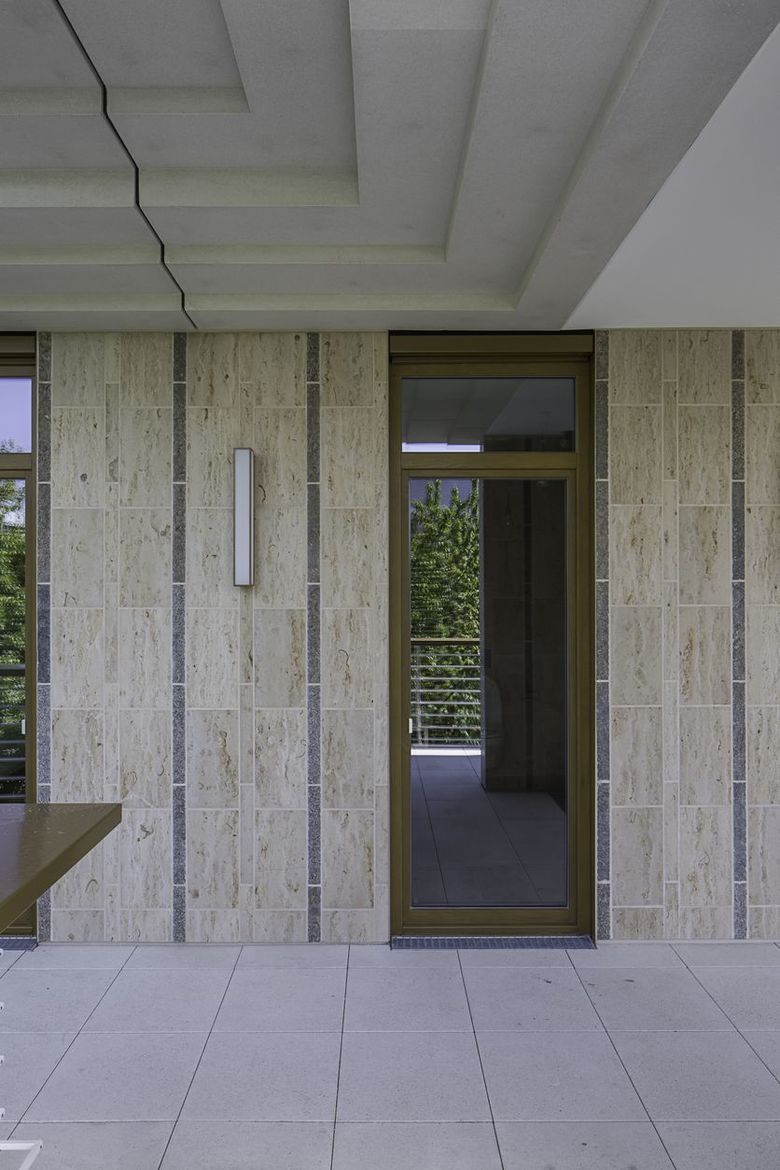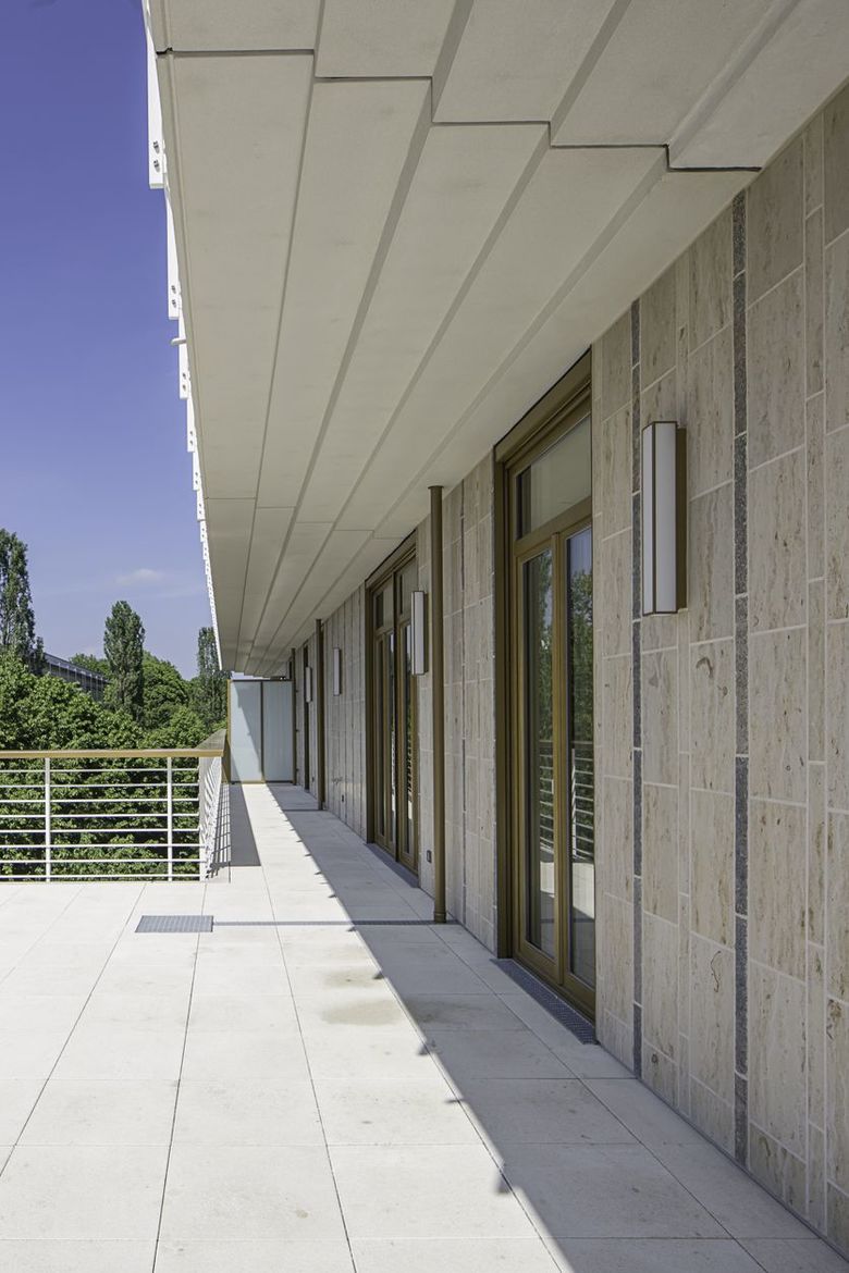 Auch die Fassaden treten mit einem regelmäßigen Rhythmus aus hellen Stützen und kontrastierenden Fenstern in Bezug zu den Nachbargebäuden. Anstelle der ortsüblichen Materialien Metall und Glas kam bei der Gestaltung Naturstein zum Einsatz. Einerseits wird dadurch der Besonderheit eines zeitgenössischen Büro- und Wohngebäudes in diesem von Verwaltungsbauten der 60er Jahre geprägten Areal Rechnung getragen. Zugleich stellen der verwendete Stein und die besondere Technik der Verlegung eine weitere Reminiszenz an Sep Ruf und den Münchner Wiederaufbau dar. Im Bereich der Stützen bilden dunkler Muschelkalk und heller Travertin ein attraktives Muster, das in seiner kleinteiligen Anordnung jeden Anklang an massiven Stein bewusst vermeidet. Als Fortführung der Stützenverblendung werden die Wandscheiben hinter den Balkonen und in den Erdgeschossen auch auf der Fläche mit Naturstein verkleidet. Die restlichen Wandbereiche und die Untersichten erhalten eine glatte Putzoberfläche, deren Farbigkeit mit den Natursteinplatten abgestimmt wird.