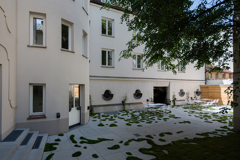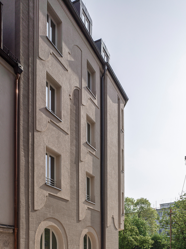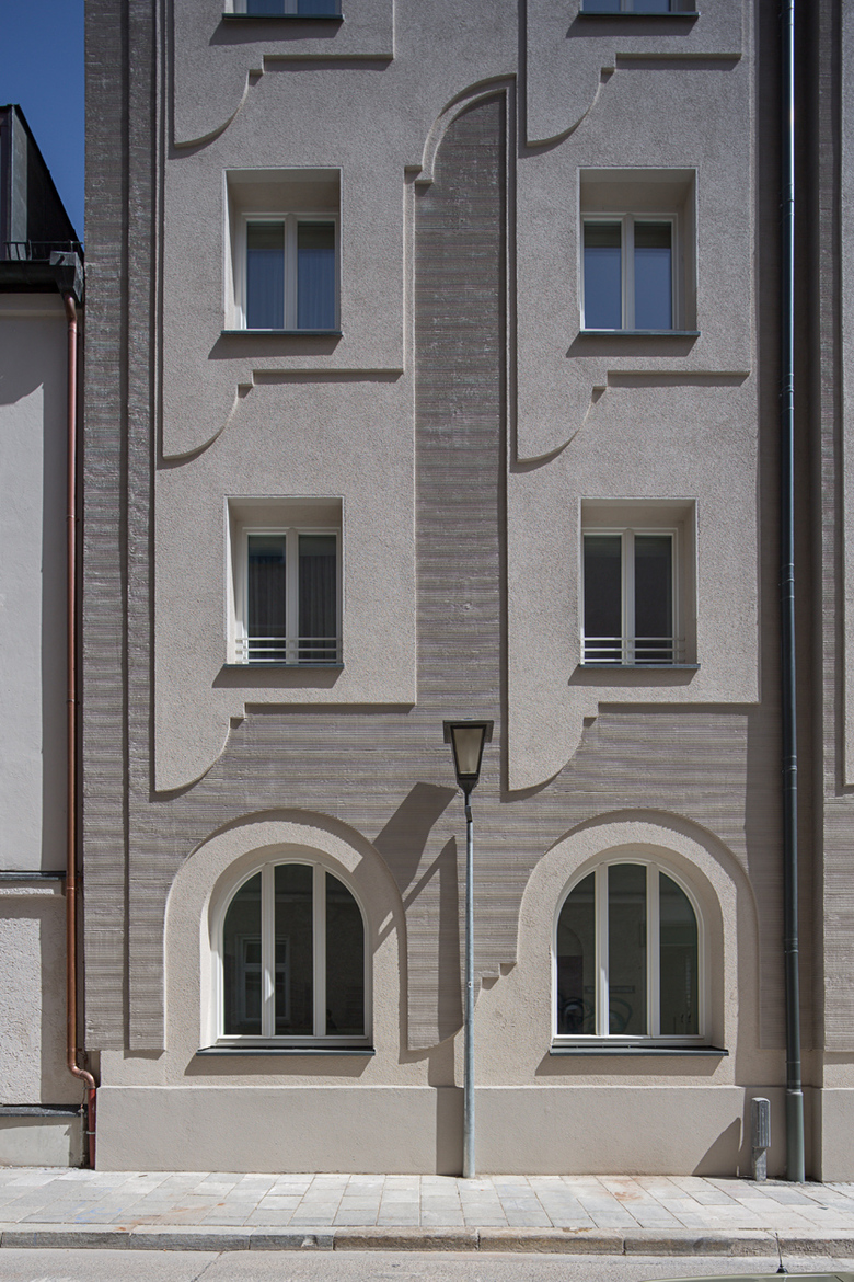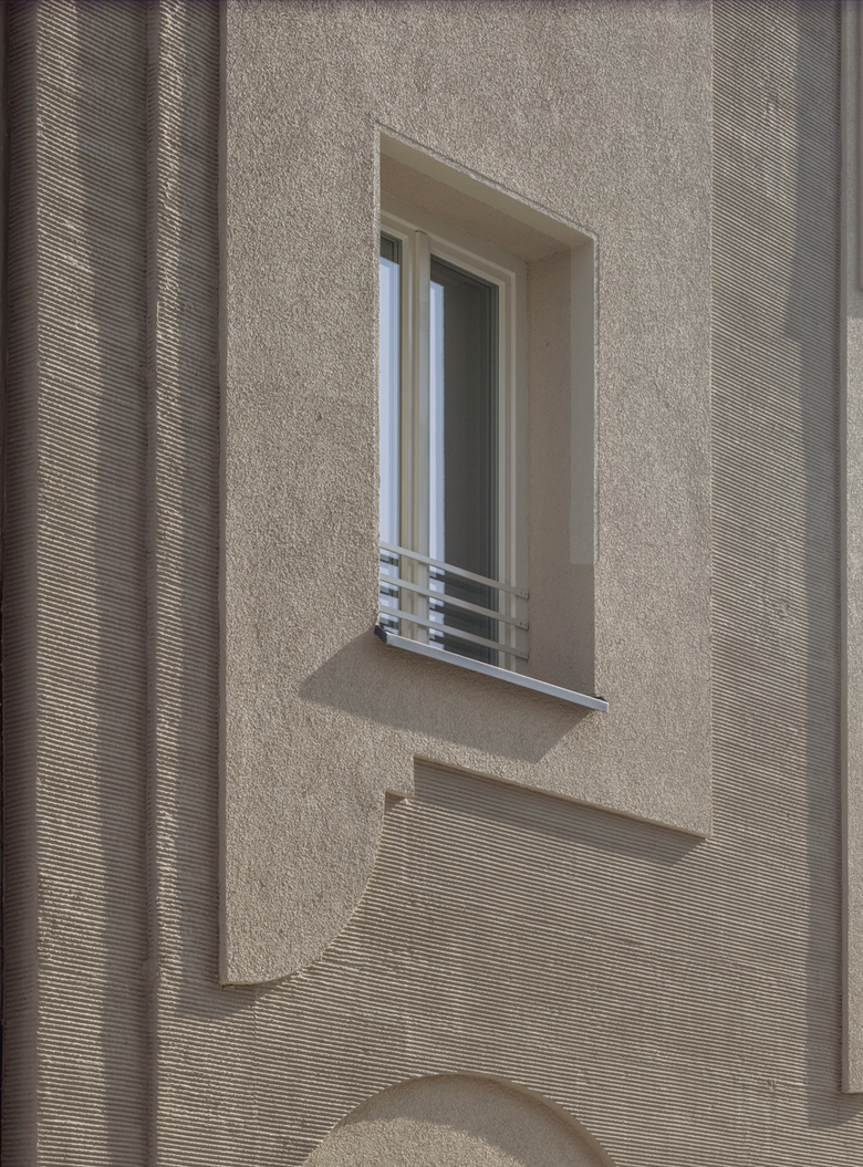 Auch da sich das Gebäude in unmittelbarer Nähe zu denkmalgeschützten Gebäuden befindet, war auf die Gestaltung der Außendämmung besondere Sorgfalt zu verwenden. Die Fassade zeigt sich nun – in der gewählten Ornamentik wie in den verwendeten Putzstrukturen – als moderne Interpretation im Umfeld vorgefundener Putzreliefs. Für ihre spezifische Ausprägung standen die energetischen Besonderheiten des Bestandes Pate: Nachdem die Dicke der Außenwände nach oben hin abnimmt, nimmt die erforderliche Dämmstärke geschossweise zu. In nach oben hin zunehmenden Schichten erhebt die Wärmedämmverbundfassade diese Vorgabe zum formalen Prinzip ihrer Gliederung. Zugleich galt es waagrechte Flächen, auf denen sich Wasser sammeln und die Fassade angreifen könnte, zu vermeiden. Das Relief ist insofern Zeugnis eines ästhetischen Umgangs mit konstruktiven Begebenheiten.