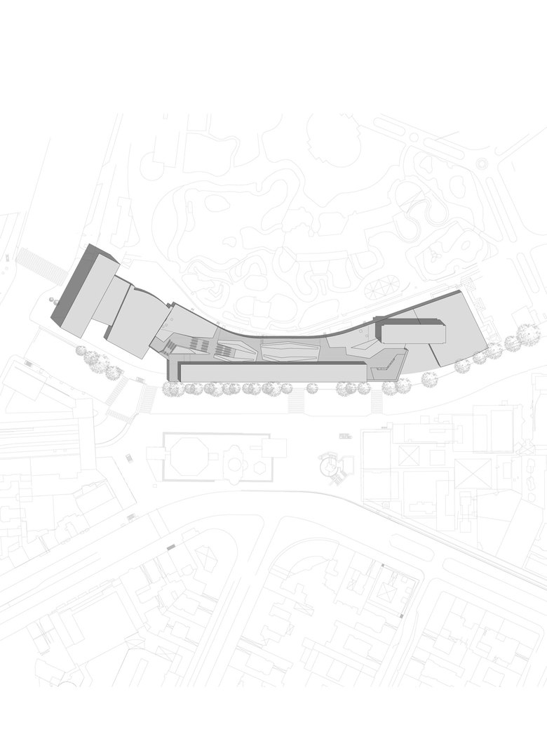 Die Historie der Bestandsgebäude setzt sich bis in die Materialität der Neubau-Fassaden hinein fort: Der Umbau erforderte es, eine Reihe von geschichtsträchtigen Konstruktionen und Materialien zu ersetzen, so zum Beispiel die durchgefärbten Glaspaneele der alten Fassaden. Um ein Stück der alten Substanz in den neuen Bauzustand zu retten und damit Kontinuität herzustellen, wurden die Original-Glasflächen des Gebäudes geschreddert und als Zuschlagstoff im Putz der neuen wärmegedämmten Gebäudeteile verwendet. In einer plastisch „gefalteten“ Putzgliederung, deren Elemente sich wie die Volants eines sommerlichen Kleidungsstückes überlagern, führen die alten Baustoffe ein neues Leben. Die Bestandsfassaden setzen sich materiell, in der textilen Anmutung jedoch auch formal fort. Es entstehen Assoziationen, die zwischen der neuen Nutzung und der Geschichte des Gebäudekomplexes vermitteln.