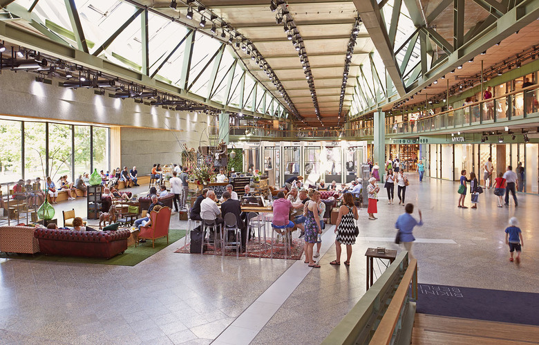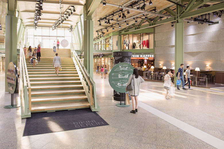 Der Eindruck von Leichtigkeit und Transparenz prägt auch den Innenraum des Erweiterungsbaus für die neuetablierte Concept Mall. Als Leitmetapher der bis zu dreigeschossigen Überbauung des ehemaligen Lieferhofes fungiert das Bild von „der großen Brücke“. Dieser Assoziation entsprechen die Träger aus Stahlfachwerk, die unverkleidet die Optik vor allem der dreigliedrigen Halle im Erdgeschoss bestimmen. Zum benachbarten Zoo hin öffnet sich diese mit einem 4 x 14 m großen Fenster, das den Blick freilässt auf den von Pavianen besetzen „Affenfelsen“. Die Grün-Töne der gesamten Innenraumgestaltung beziehen sich direkt auf diese Nachbarschaft. Mit massiven Eichenbohlen und Holzpflasterparkett, mit roh verbleibendem Stahlbeton und lediglich gewachstem Stahl folgt die Materialwahl maßgeblich dem Wunsch nach „Authentizität“. Mit den sogenannten BikiniBoxes wurde ein bisher einzigartiges modulares System entwickelt: Kleinere temporär nutzbare Ladeneinheiten sind inselartig über die gesamte Halle verteilt und stehen für experimentelle Konzepte zur Verfügung. Die mögliche Mietdauer beträgt drei bis maximal zwölf Monate.