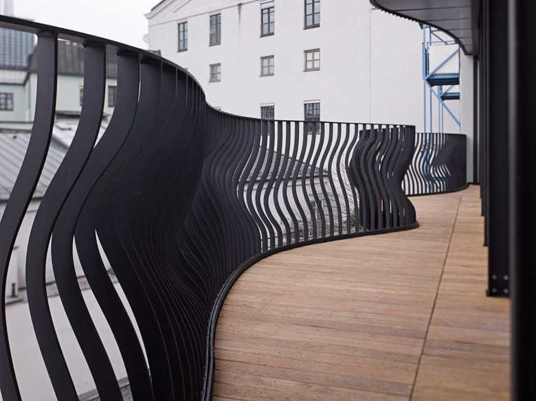 Die dreiteilige Gliederung der Fassade greift ein seinerzeit gängiges Gestaltungsmittel, sogenannte Bossen, auf und verfremdet es zugleich: Durch unterschiedliche Höhe der einzelnen – hier in Putz ausgeführten – überstehenden Elemente entsteht ein wellenförmiges Relief. Diese Fassadenstruktur erzeugt ein je nach Sonnenstand und Blickwinkel differenziertes, eindrucksvolles Schattenspiel. Die ursprünglich antikisierende „Schwere“ der Bossen gerät dadurch in einen reizvollen Gegensatz zur Beweglichkeit der Lichtstimmungen. Der spielerische Umgang mit kontrastierenden Gestaltungselementen und das prägende Wellenmotiv finden ihre Fortsetzung im ruhigen Innenhof. Organisch geformte, in den Etagen intelligent zueinander versetzte Balkonflächen laufen über die gesamte Gebäudebreite und erzeugen ein Wechselspiel aus Enge und Weite, Privatheit und Offenheit. Erschlossen werden sie durch raumhohe Fenstertüren, wodurch sich die Belichtungssituation der Wohnungen wesentlich verbessert.