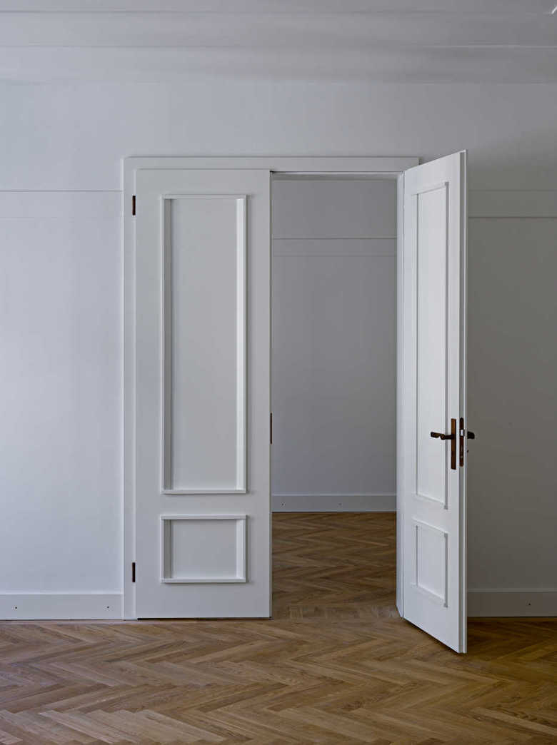 Im Inneren bleibt die bestehende, bürgerlich repräsentative Raumeinteilung weitgehend erhalten. Teilweise wird auch hier die Belichtung durch neue großzügige Durchgänge verbessert. In Kombination mit beeindruckenden Raumhöhen, modern interpretiertem Stuck an Decke und Wandflächen, elegantem Fischgrätparkett und profilierten Doppelflügeltüren ergibt sich auch hier der Eindruck eines „zeitgenössischen Altbaus“. Im Sinne der ökologischen Nachhaltigkeit liefert eine Solarthermieanlage einen erheblichen Teil der zur Warmwasserversorgung des Gebäudes benötigten Energie.