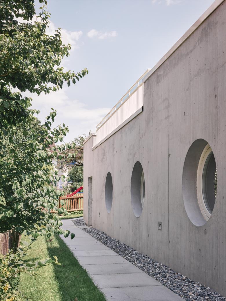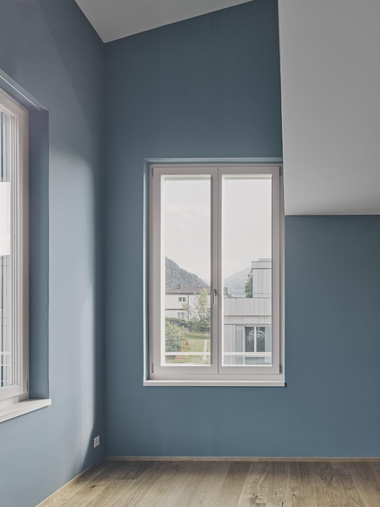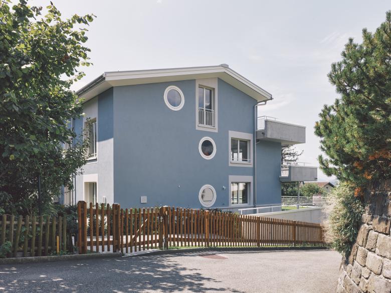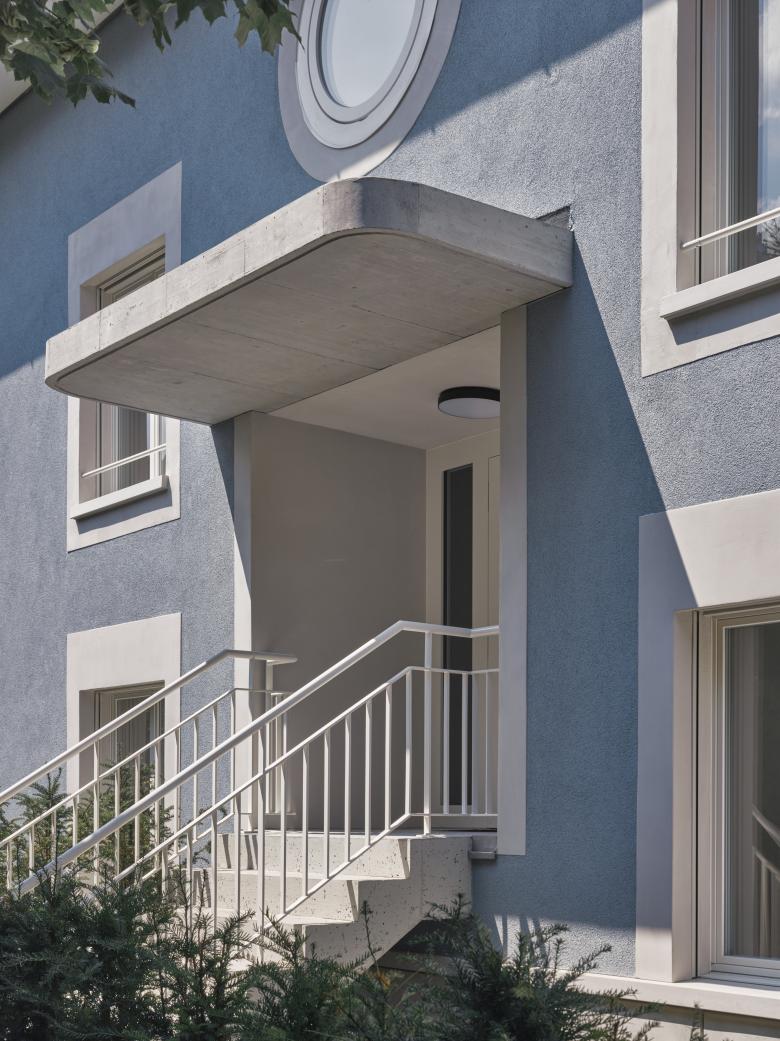 Der Ausdruck und die Grundrissgestaltung des Mehrfamilienhauses orientieren sich an den im Quartier noch erhaltenen, einfachen Baumeisterhäusern. Die Grundrissaufteilung – mit den Schlafzimmern nach Osten und den Wohnräumen, einschließlich eines grosszügigen Wintergartens und Balkons, nach Westen – ist klar und funktional strukturiert. Analog zu den bestehenden Gebäuden wurde das Mehrfamilienhaus in Massivbauweise errichtet und verputzt. Der Verputz als gestalterisches Element wurde mit besonderer Sorgfalt eingesetzt und prägt auf einfache Weise das Erscheinungsbild des Gebäudes.
