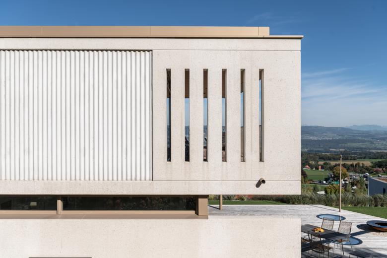 So wird es realisiert: zeitgemäss, mit klarer Formensprache, strenger Geometrie. Dazu die sanften Sinus-Bögen der gewellten Betonfassade – ein reizvoller Kontrast. Und eine schöne Hommage.