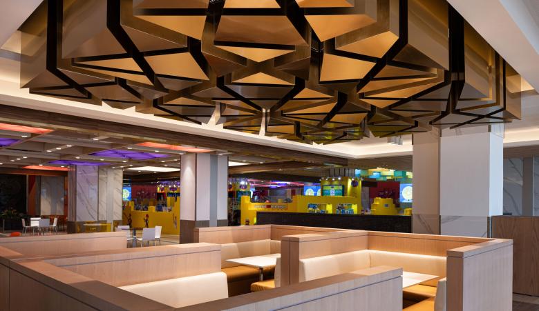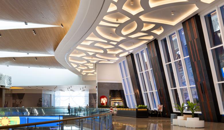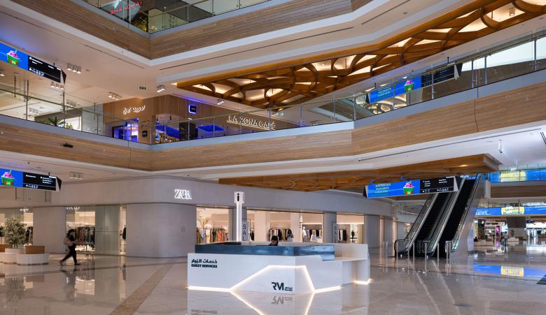 The Mangrove Atrium, the heart of the mall, is the largest open space, programmed to host different events and acts as the main access point from the parking levels situated above ground. On the top floor, the Mangrove Food Court evoques the mangrove forest with patterned columns in shades of green and blue which emerge like trees, with two skylines that fill the space with natural light.