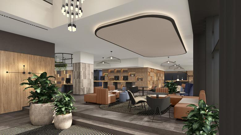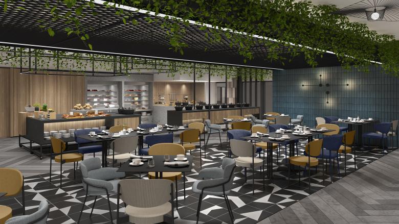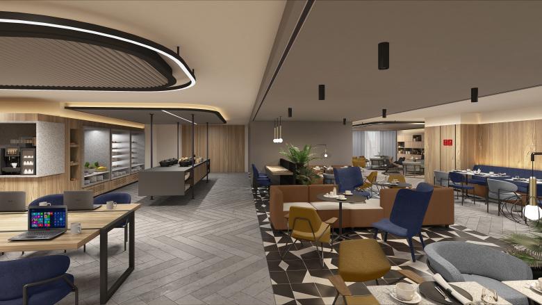 The design proposal is based on combining extensive areas of color with delicate black profiles. This “framing” effect is also achieved with light profiles that divide the different spaces within the same room or frame a particularity within the space such as the buffets within the ADD or a specific sofa area within the informal meeting. The combination of the natural texture of the wood with the geometric patterns coming from the tiles or the patterns on the carpets give this feeling of modern warmth.