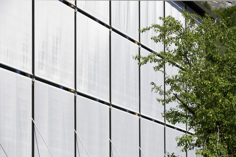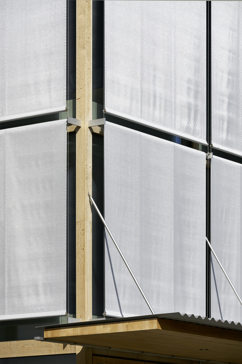 Der Sonnenschutz ist an filigranen Schwertern befestigt, welche aus den Holzpfosten hinauskragen. Die Drahtseilführungen sind einteilig über drei Stockwerke durchgehend und jeweils an den Schwertern geführt. Sämtliche Stahlteile sind aus Chromstahl. Das transparente Textil ist doppelseitig aluminisiert.