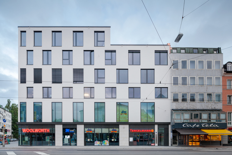 Auf dem rund 2.000 Quadratmeter großen Grundstück an der Tegernseer Landstraße entstand so ein Büro- und Geschäftshaus mit 3.630 Quadratmeter Einzelhandelsfläche im Untergeschoss, Erdgeschoss und im 1. Obergeschoss sowie ca. 1.400 Quadratmeter Bürofläche in den Stockwerken zwei bis fünf. Besonders hervorzuheben ist, dass zugunsten von Verkaufsflächen keine Tiefgarage geplant, sondern das Parken in das 2. Obergeschoss verlegt wurde.