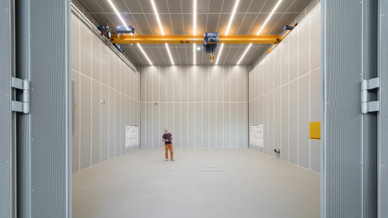 In dem neuesten Gebäude der TU Darmstadt auf dem Campus Lichtwiese wird die Schallabstrahlung von Maschinen erforscht. In der Ästhetik des Gebäudes spielt das Thema Licht eine große Rolle – sei es durch die Reflexionen der Sonne in der puristisch gestalteten Metallfassade oder das Tageslicht, das durch die durchgängige Fensterfassade in die Halle des Gebäudes flutet. „Städtebaulich bildet das Gebäude gemeinsam mit dem ebenfalls von uns gebauten Lehrzentrum für Maschinenbau eine Einheit“, erklärt Entwurfsverfasserin Susanne Gross.
