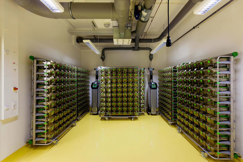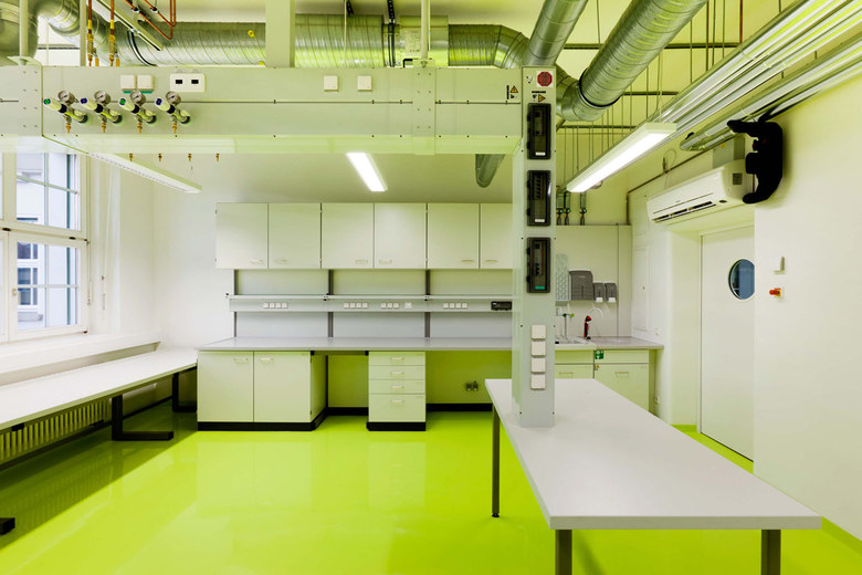 Durch die bestehenden geringen Geschosshöhen galt es, ein spezifisches Erschließungssystem zu generieren, um die lufttechnischen Anforderungen der Tierhaltungs- und Laborbereiche (S2) zu erfüllen. Nun gewährleistet die klare vertikale Struktur - Tierhaltung in den unteren Geschossen, darüber Labore und Verwaltung - einen optimalen Ablauf der translationalen Forschung und Anwendung.