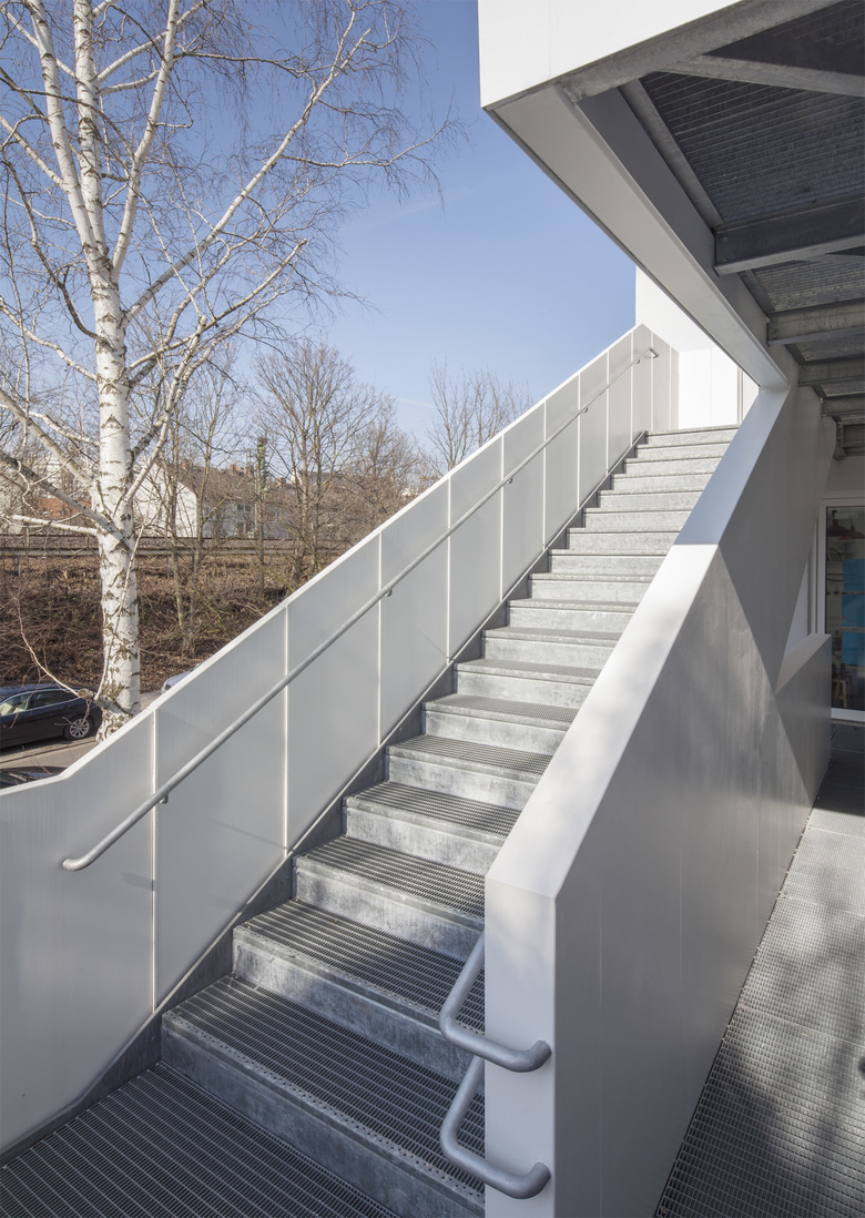 Konstruktion. Das Stahltragwerk der Treppe besteht aus einer gezackten tragenden Wand, die in das Bestandsgebäude rückverankert wird. Es wurde aus feuerverzinkten Stahlelementen und -stufen vorgefertigt und mit elementierten, weiß beschichteten Blechen verkleidet.